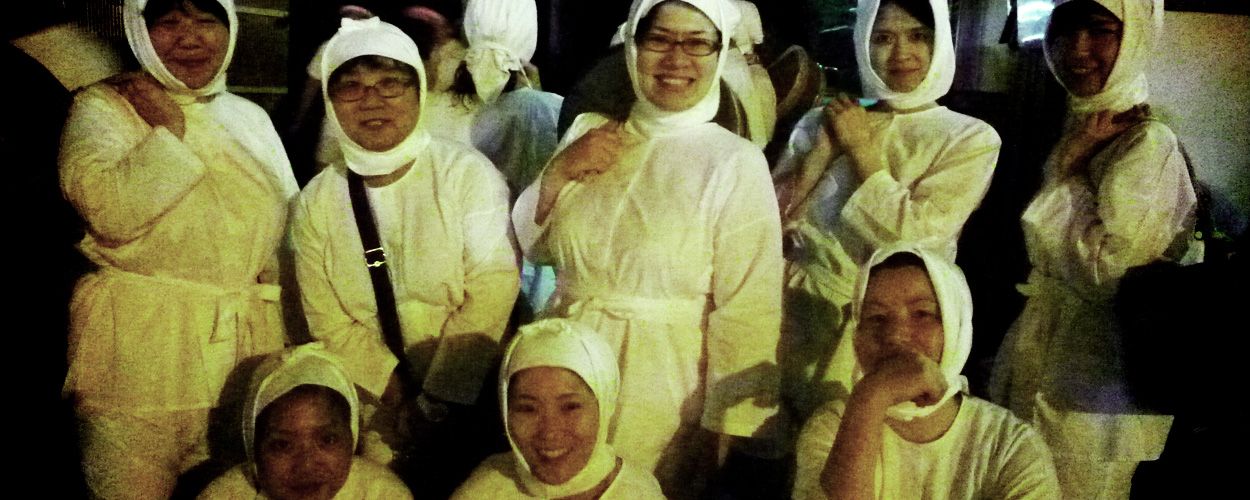 慌てて本部前に向かうと、そこにはすでに海女の衣装に着替えた参加者達が集まってきていた。大急ぎで私も衣装に早変わり。頭の頭巾だけがどうしても上手く巻けずにいたら、周りの参加者も同じだったようで、参加者同士で互いの頭巾の巻き合いが始まった。私もそばにいた人に巻いてもらい、なんとかきちんと装着。これでもう、足の先から頭の先まで全身白づくめだ。