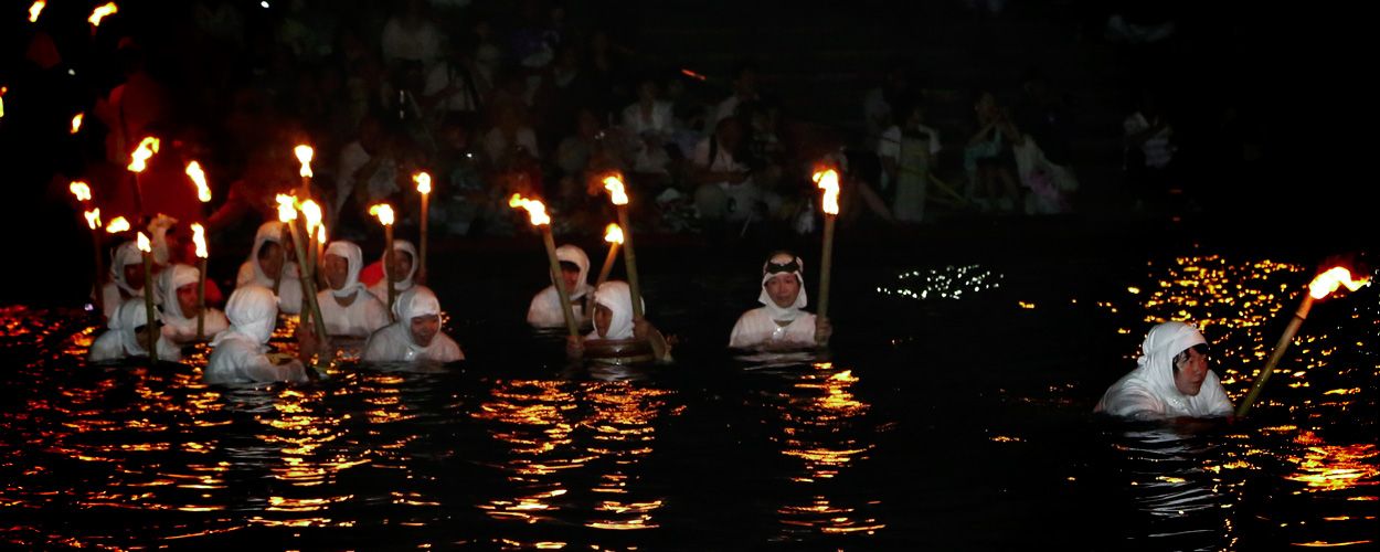 夜の海を、松明を手に輪になって泳ぐ白装束の海女達。