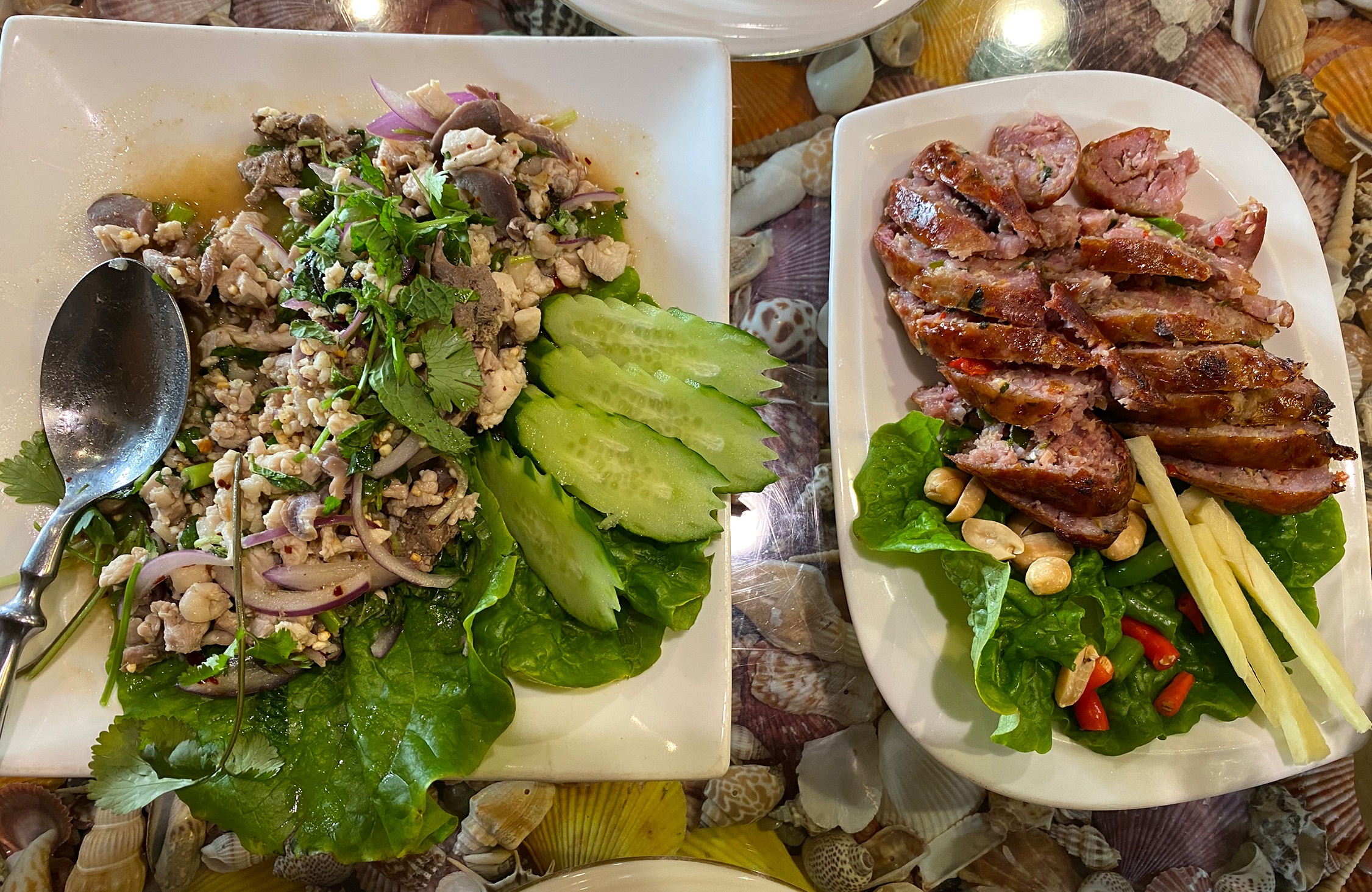牛肉を細かく炒め香草と絡めたスパイシーサラダ「ラープ」、「サイ・コーク」という名のラオス風発酵ソーセージ、パパイヤサラダ「タム・マク・フーン」、もち米の「カオニャオ」を注文した。どれもこれも本格的で絶品だった。ただし、辛さは少し控えめ。