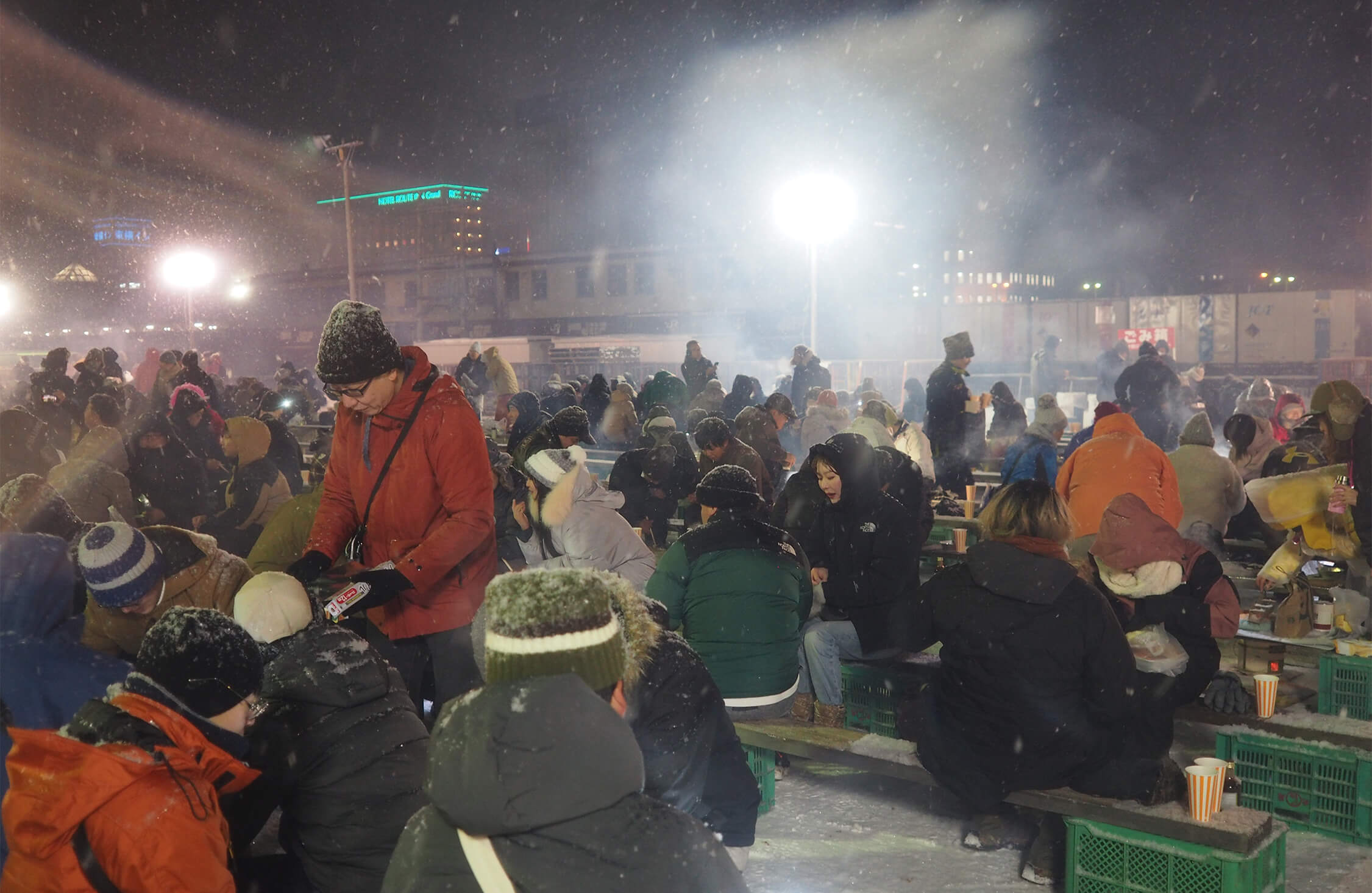 2月9日、開場時間の17時30分を迎えると、細雪が舞い散る会場には、全国から集った物好き……いや、焼き肉好きでごった返していた。その数、なんと約2000人! アナウンスによると、沖縄から来た人もいたそうだ。その旅費で、地元で焼き肉を食べたら何人前になるのかなんて、無粋な想像をする人は北見まで来ない。