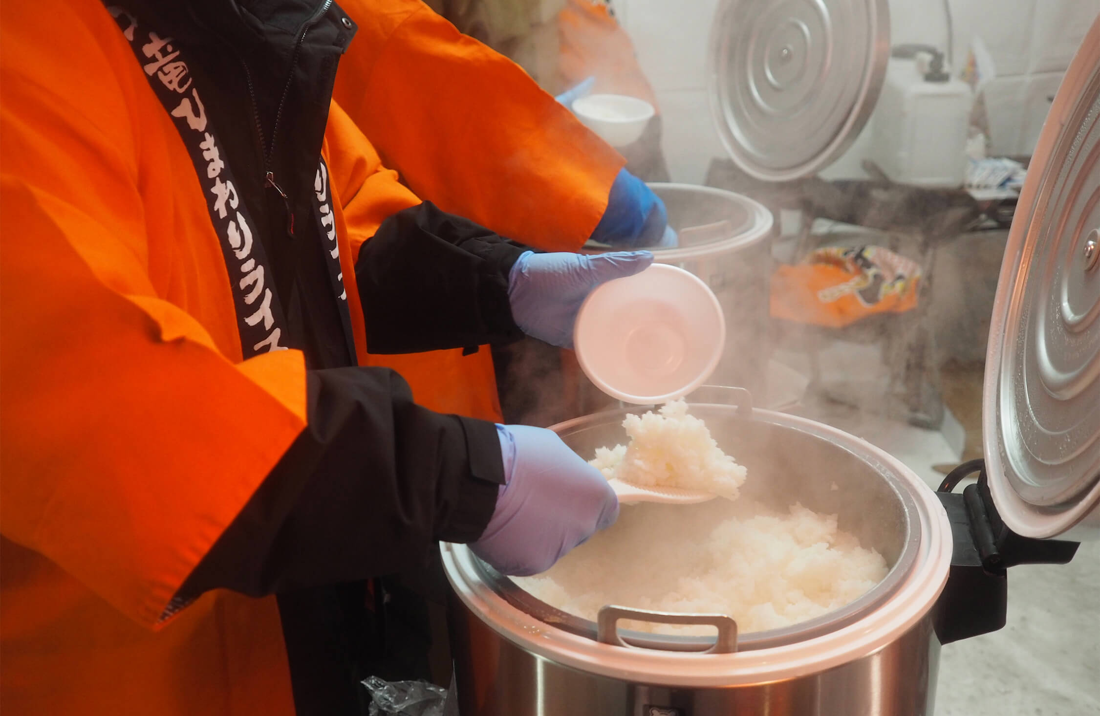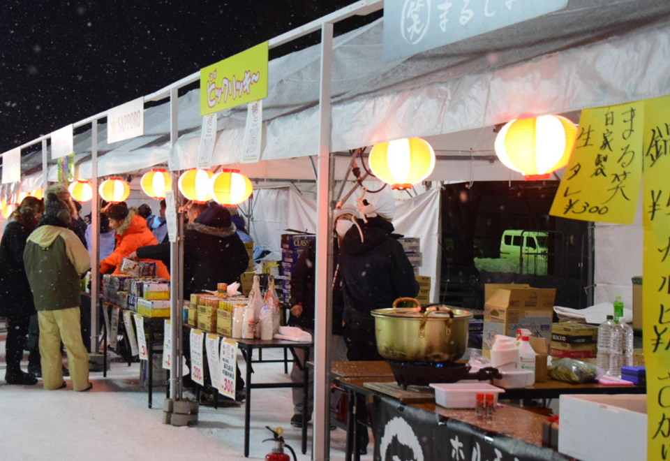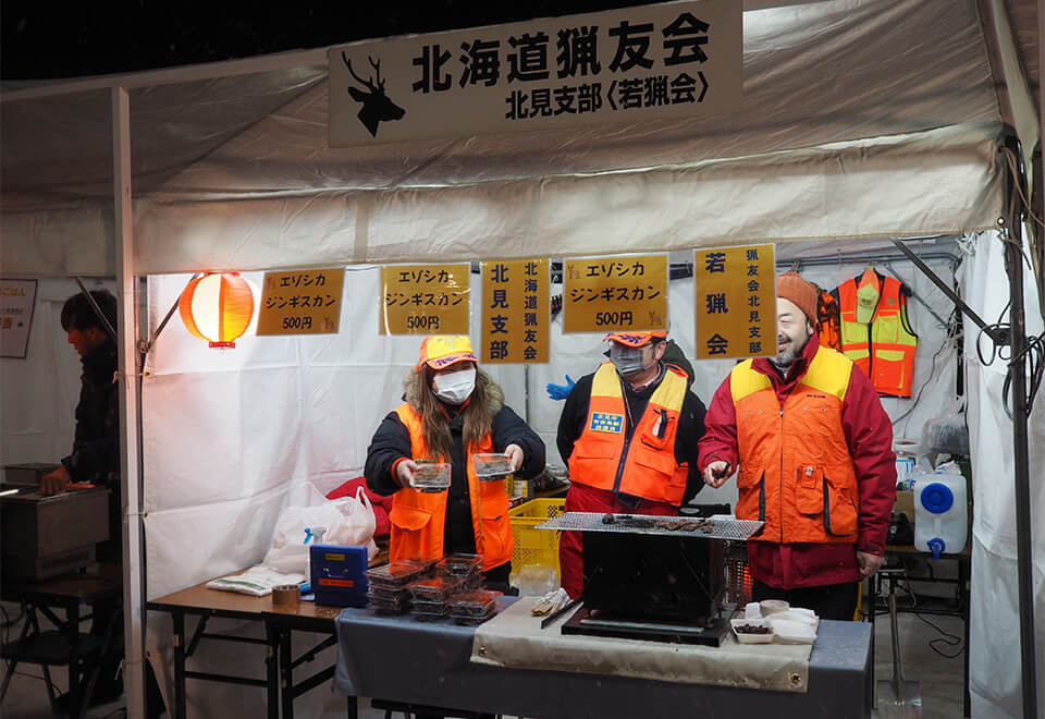 受け付けでお肉を受け取った僕らはまず、出店を見て周った。「北見おでんとまぐろ」「エゾシカジンギスカン」「厳寒のスナック」などなど個性的な看板が並ぶ。こういうローカル感も、たまらない。あるテントでは、北海道の西部に位置する北竜町の人たちが、炊きたての「北竜町産ひまわりライス」を振る舞っていた。しかも無料!