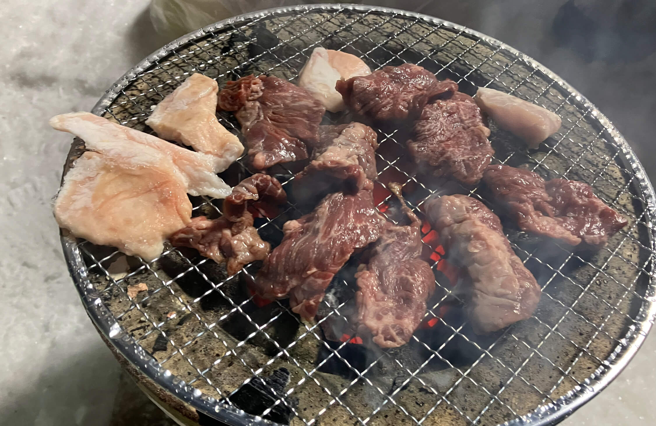 焼き肉はライスと一緒に食べる派の僕は、迷わず大盛りを注文。ほかの3人も湯気が立ち昇るほっかほっかのライスを受け取り、指定の七輪のもとへ向かった。炭には火がついていて、あとは肉を焼くだけ。これを至れり尽くせりといわず、なんと言おう。ベンチの上に薄く積もった雪を払って腰かけ、休む間もなく牛サガリと豚ホルモンを網に横たえる。いざ!