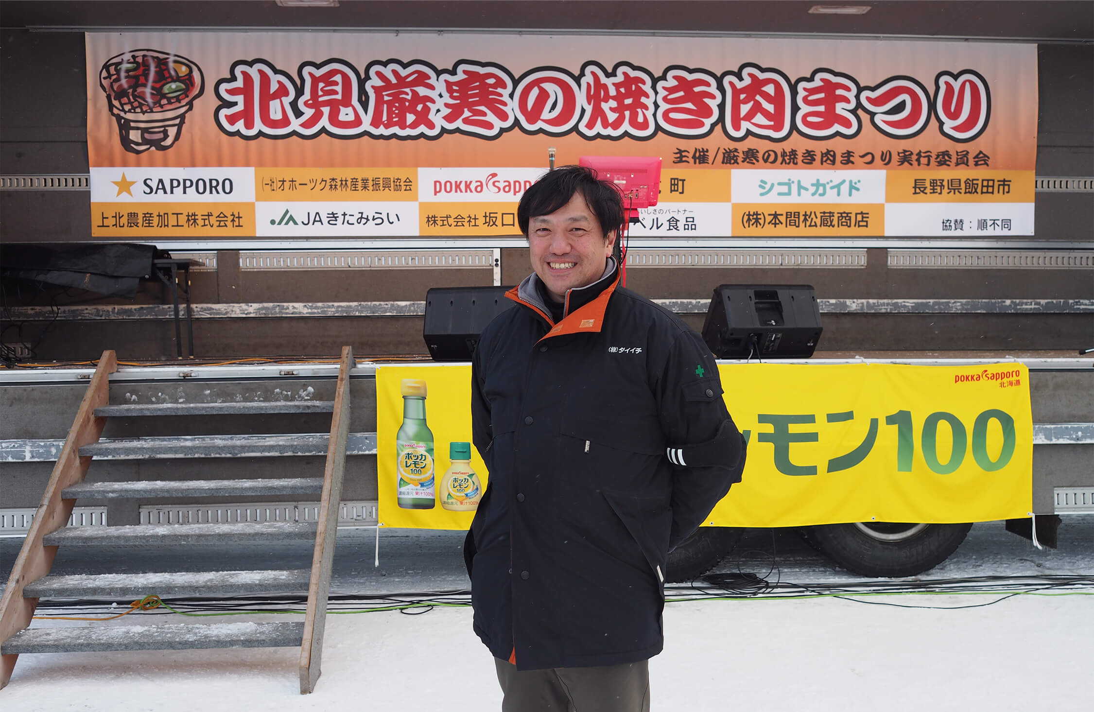 「以前から、北見の青年会議所のメンバーと、北電さん、北ガスさんなどの支店長の皆さんが集まる『でさき会』が開かれていました(現在は『ぼらんち会』)。支店長さんは転勤が多く、ほかの町のことにも詳しいので、ほかの町ではどんな取り組みをしているのか、北見ではなにをすべきか、意見を聞く機会があったんです。その時に、北見の寒い冬に外で焼き肉をしたら面白いって話になったそうです」