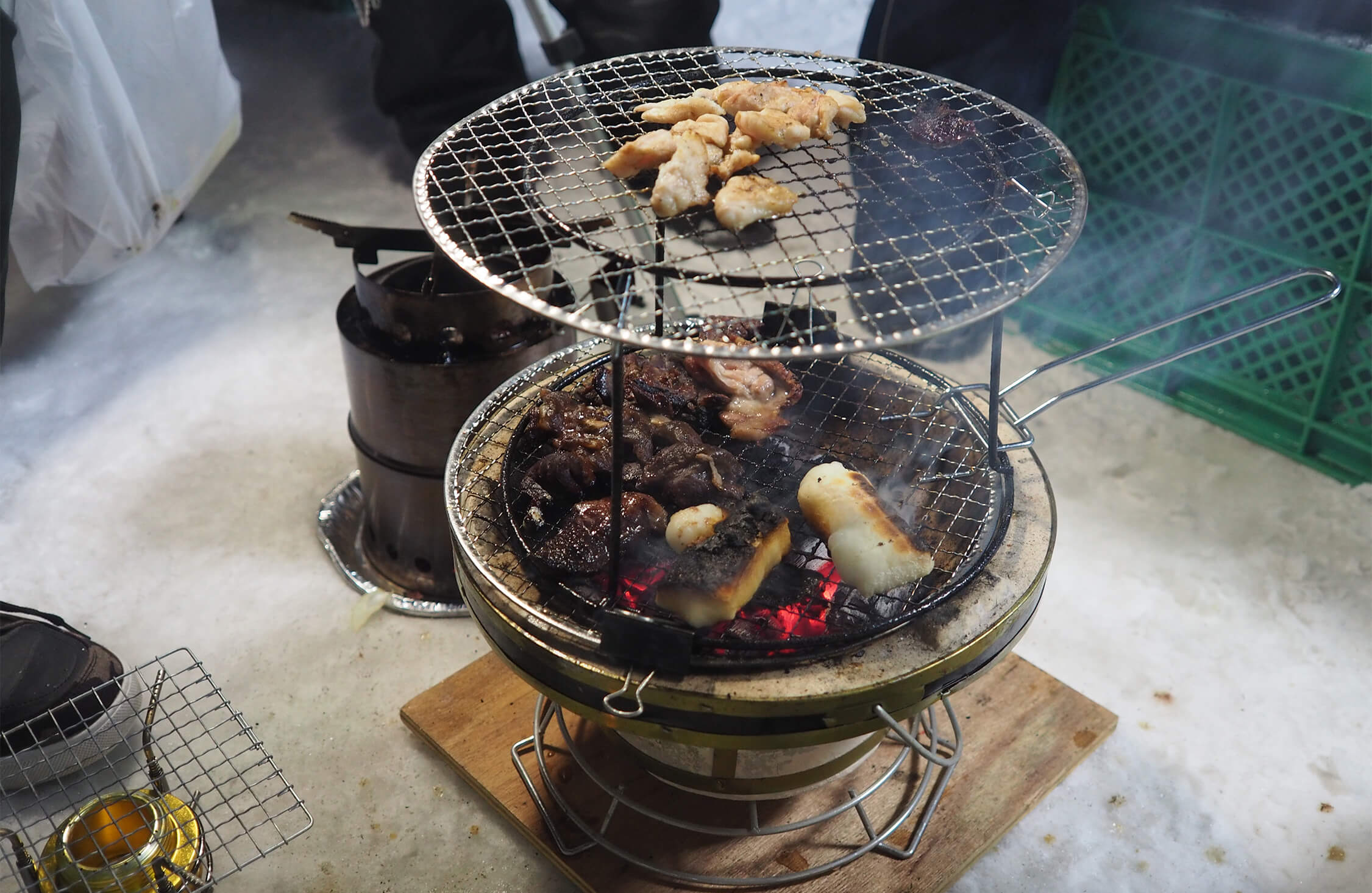 ほかにどんな人がいるんだろう? お腹が落ち着いた頃、周囲を見渡したら、「んん?」と二度見したくなるようなグループがいた。例えば、七輪の網のうえにもう一段、網を載せていた三人。話を聞くと、肉が凍るため、上の網で一度解凍してから、下の網で焼いているという。これはただ者じゃない! 何回目ですか? と聞いたら、千葉から来たという男女は「5回目」、名古屋から来たという男性は「7回目」。本気のリピーターたちは、焼き肉をより楽しむために毎年「カイゼン」を重ねていた。