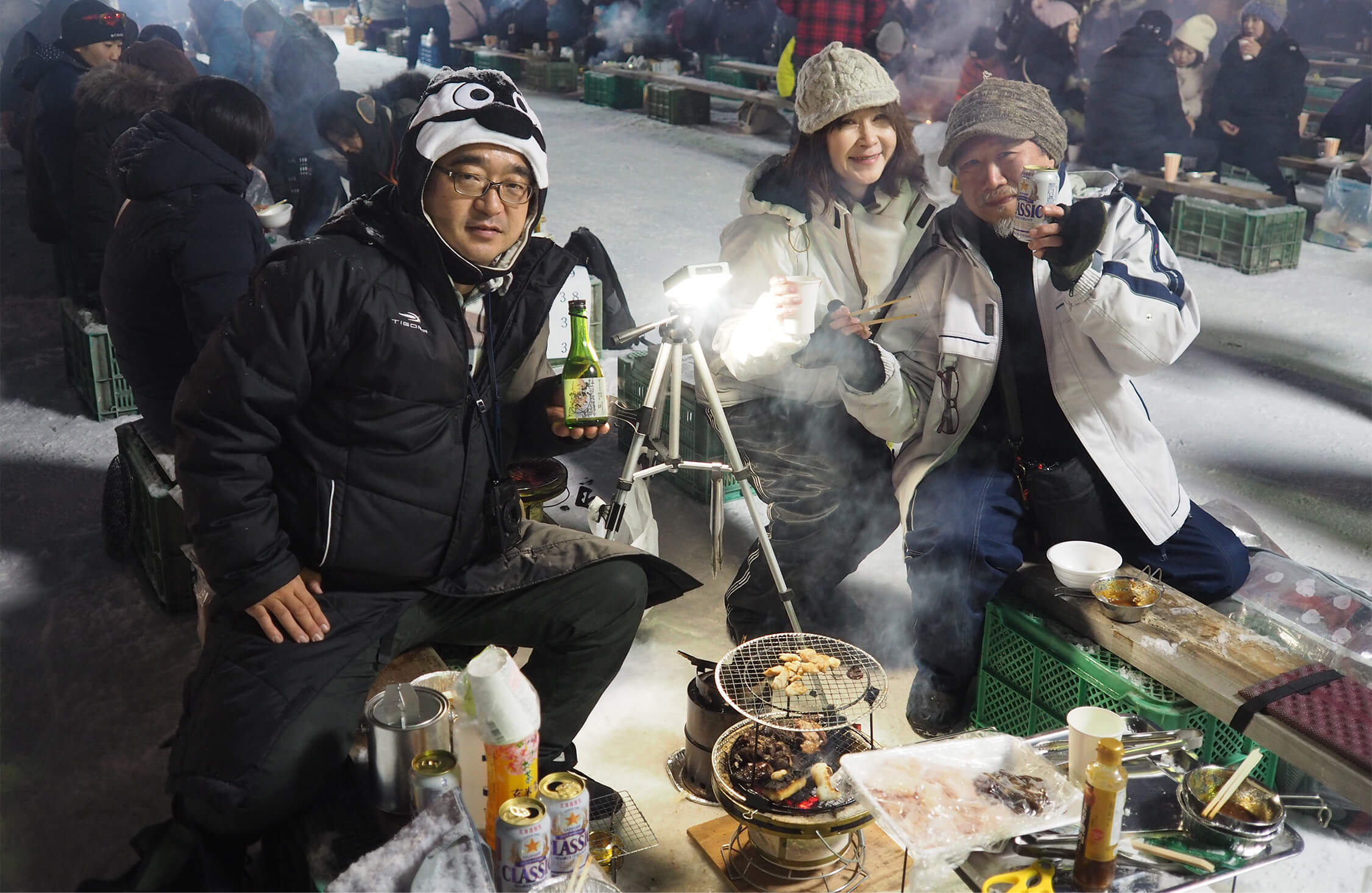 三脚のライトは、肉の焼き加減を見るため。確かに、手元が暗くて、焼けているのかどうかわかりづらかった! ほかにも、キャンプで使う暖を取るためのグッズや、熱燗を飲むための薬缶と小型コンロを持参していて、素人の僕らと比べると満喫レベルが100倍ぐらい高そうだった。「今年は暖かいですよ。去年はもっと寒くてね。ビールも凍りました」と笑う三人を見て、「この人たちは来年も来るんだろうな」と思う。
