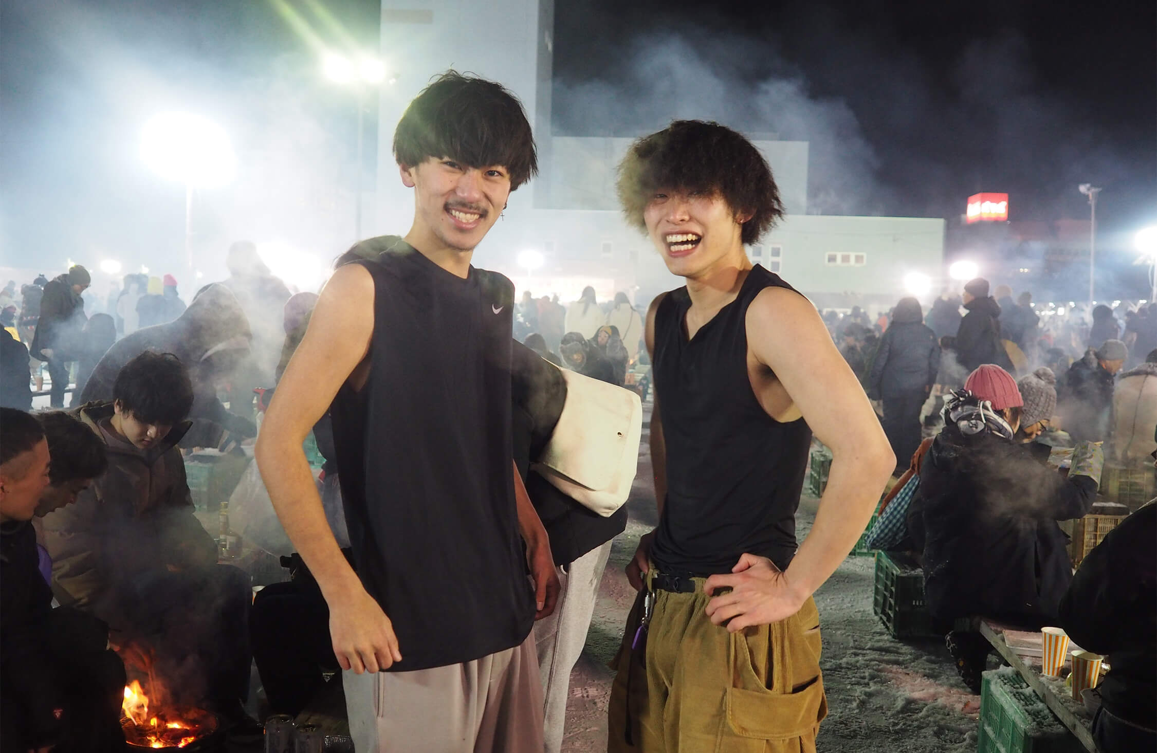 別の場所では、男子学生のグループが若者らしい雰囲気で盛り上がっていた。タンクトップのふたりの写真を撮らせてもらう。「寒くないんですよね!」というと、「ぜんぜん寒くありません!」と叫びながら震えていた。