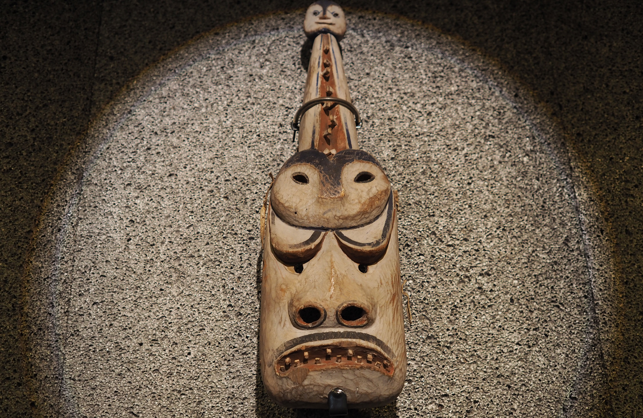「だいたい今から100年ぐらい前、19世紀末に使われていた本物の仮面ですね。上から顔が3つあるでしょう。これはエスキモーの世界観を表していて、人間の世界、動物の世界、精霊の世界を表現しています。シャマンはこれをつけて、3つの世界を行ったり来たりするわけです」