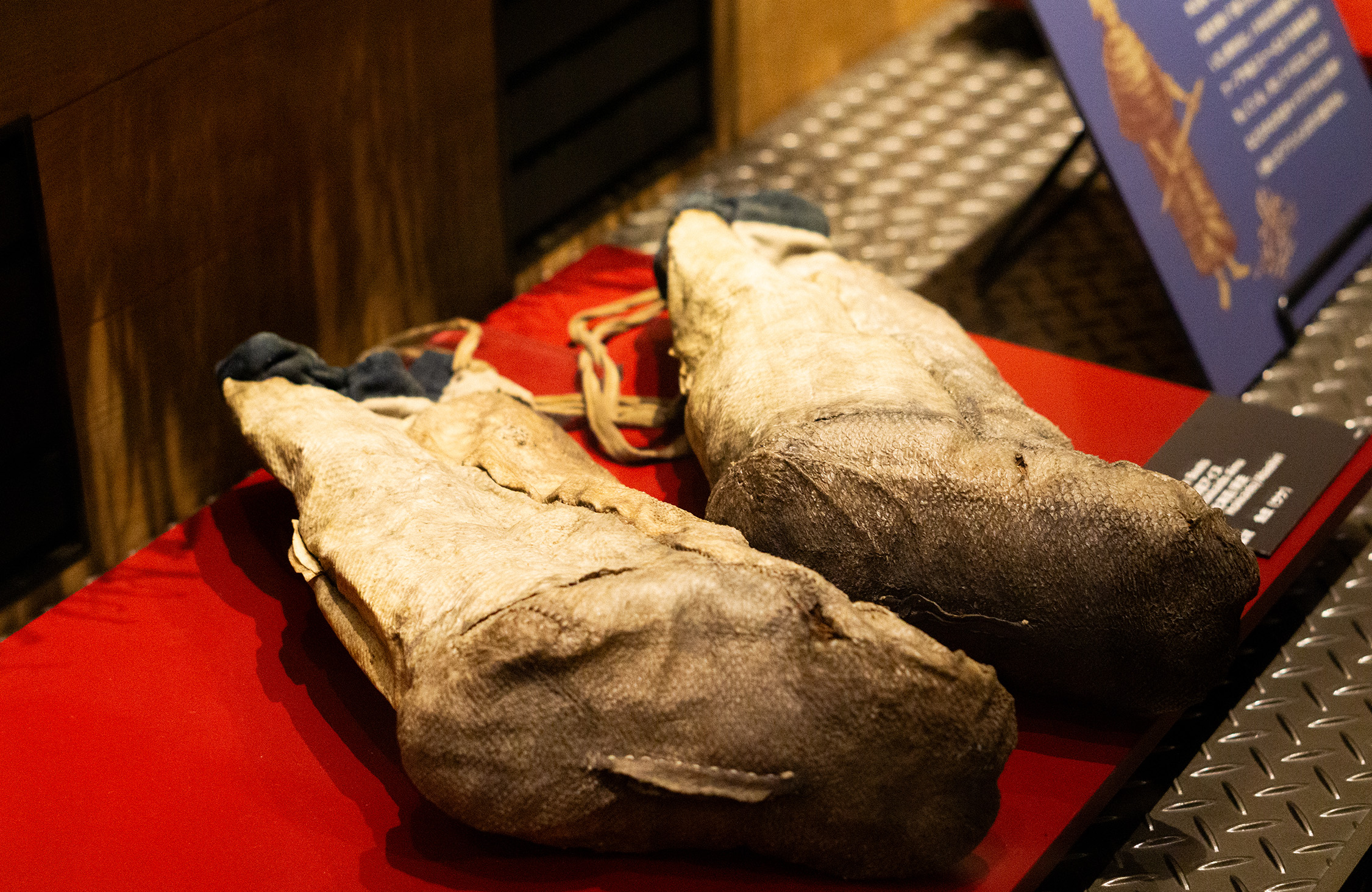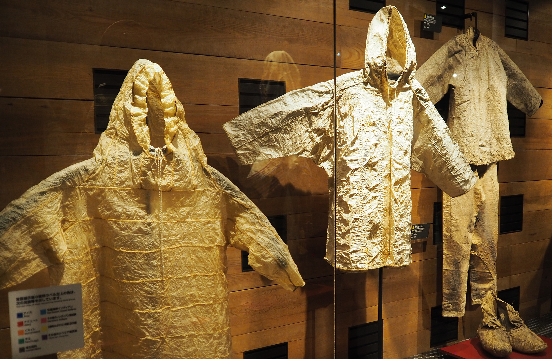 僕が目を奪われたのは、服の素材。アザラシの腸を使った「腸製服」、サケ、コイ、チョウザメといった大型の魚の皮を使った「魚皮衣」など想像もしない素材で作られた衣類がたくさん展示されているのだ。どちらも防水性を高めるために着用されていたんだけど、作りがとてもしっかりしていて、腸や魚の皮で作られているようには見えない。ここでまた、野口さんの解説に驚きの声をあげてしまった。