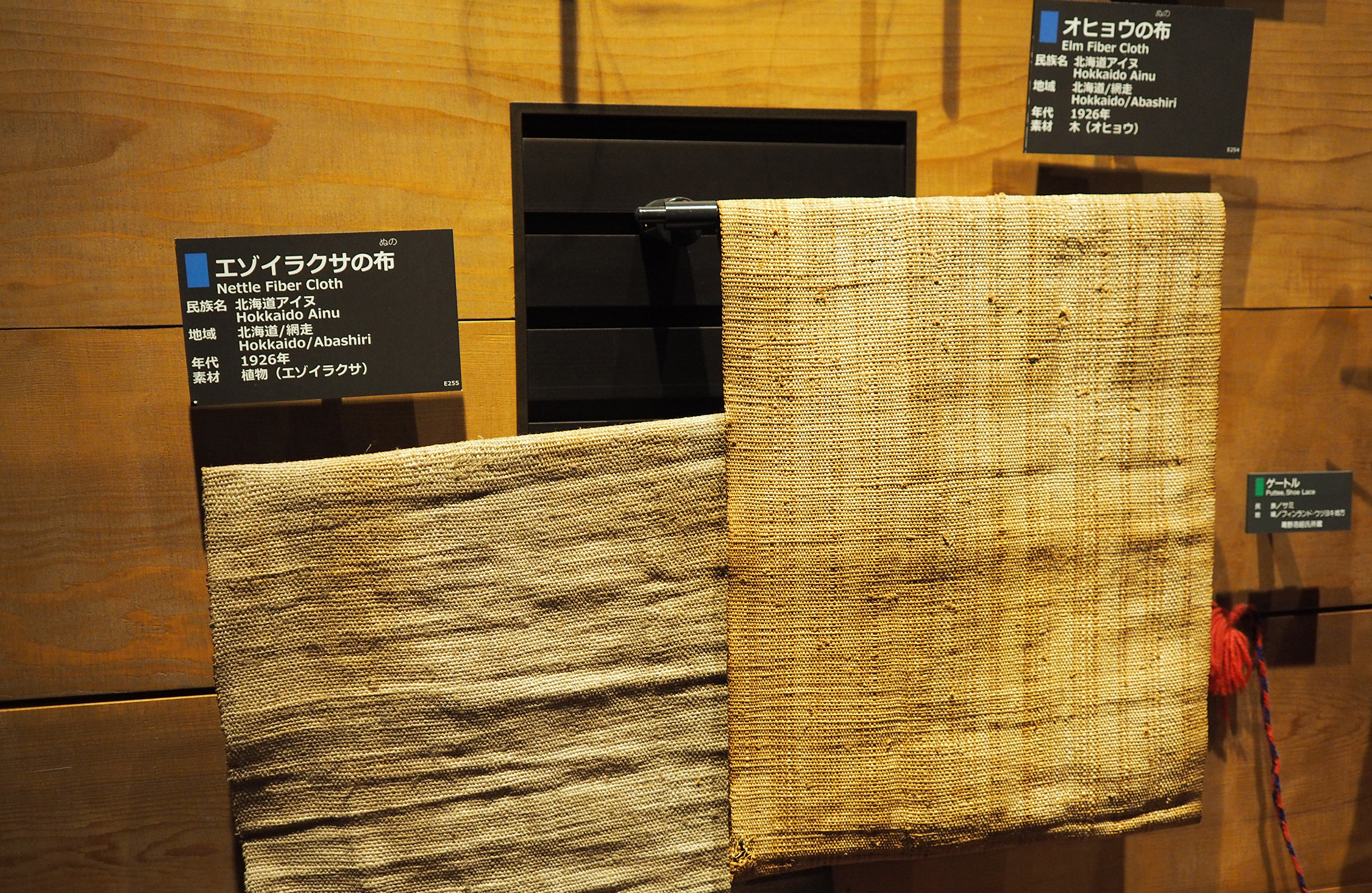 ちなみに、氷に覆われているような北極圏はほかに素材がないため動物の革や魚の皮を衣類にしたけど、南に下ってすこし暖かくなると草木が生えてくる。北海道は北方民族のなかでも緑豊かなエリアだったから、エゾイラクサ(植物)やオヒョウ(木)の皮を使った衣類も作られたのだ。人間がいかに環境に適応し、そこにある素材を活用してきたか、よくわかる。