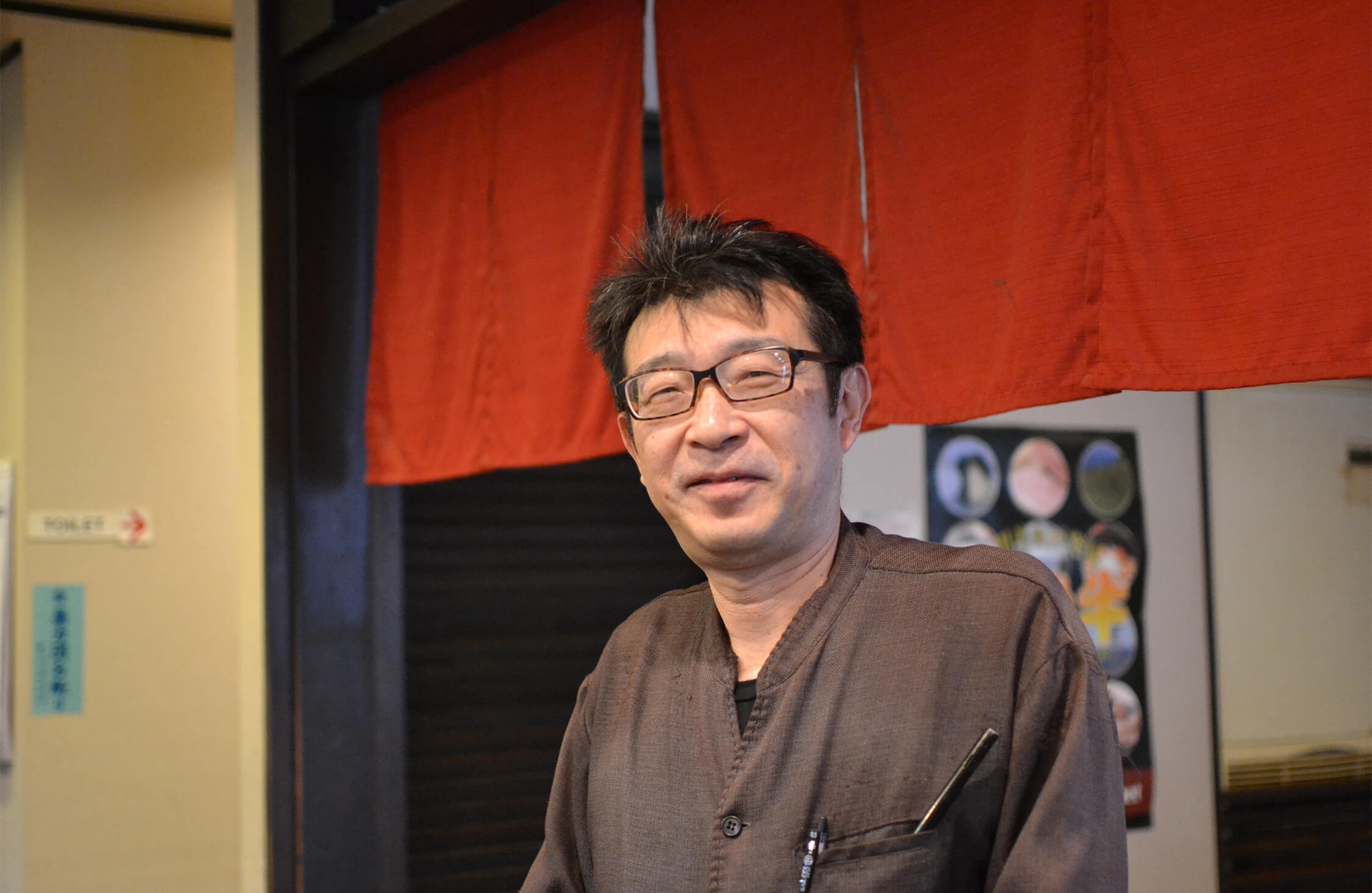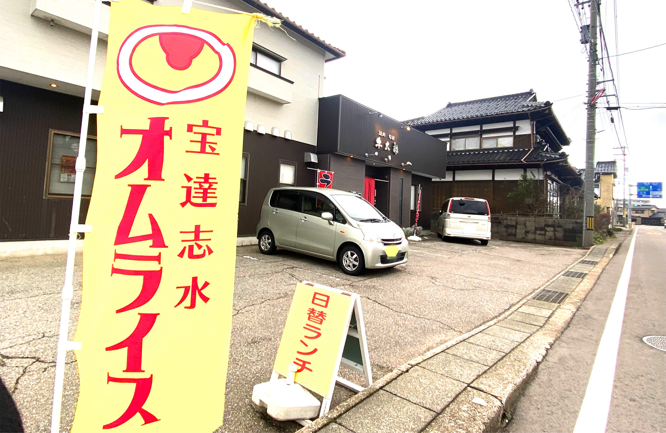 最初に向かったのは、宝達志水町今浜にある1979年創業の「焼肉旬彩 牛太郎」。金沢方面から国道249号線を能登方面へ北上すると、左側にオムライスののぼり旗が見えてくる。お店は濃い褐色でモダンな作りだ。店主の西道大作(さいどうだいさく)さん(55)は、「よっ、いらっしゃい!」と元気に出迎えてくれた。