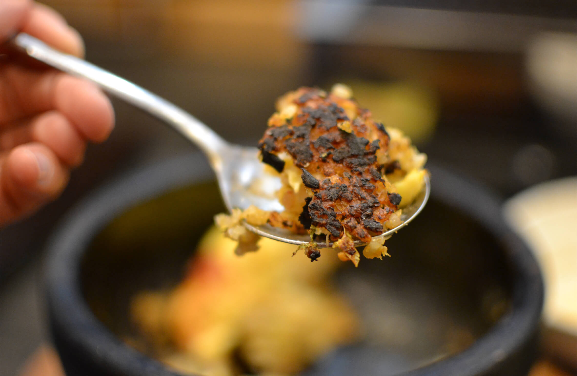 辛さはまったくない。ふわふわの黄色い卵の下には、熱々で濃厚なビビンバごはんが待機している。スプーンですくうたび、湯気がふわあっと立ち上る。底にできたお焦げにはタレが染みこんで絶品だった。