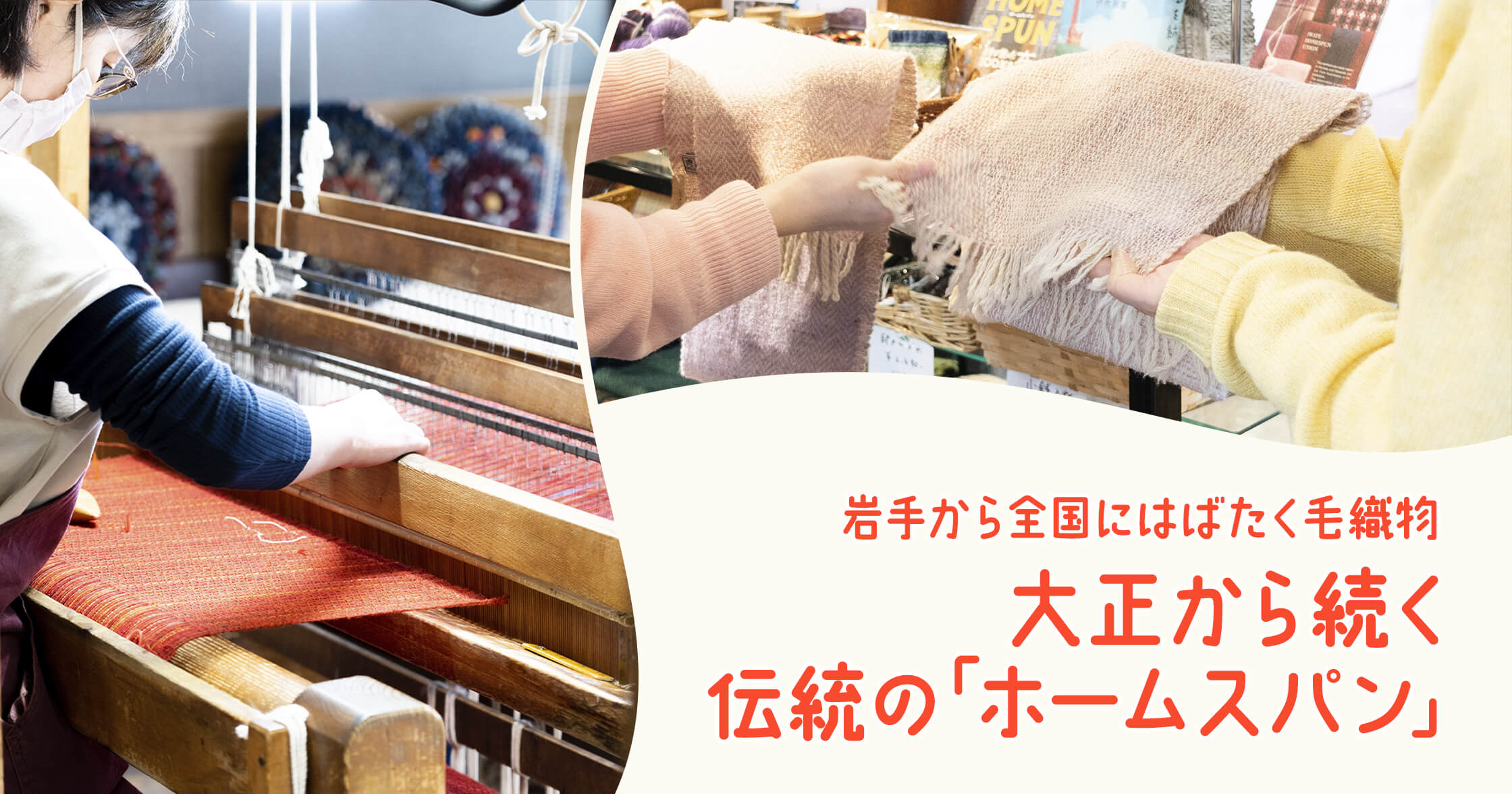ホームスパンの語源は、ホーム(家で)、スパン(紡ぐ)。岩手では大正から昭和にかけて農家の副業として定着したそうだ。日本のホームスパンの8割は岩手で生産され、地場産業として根付いている。