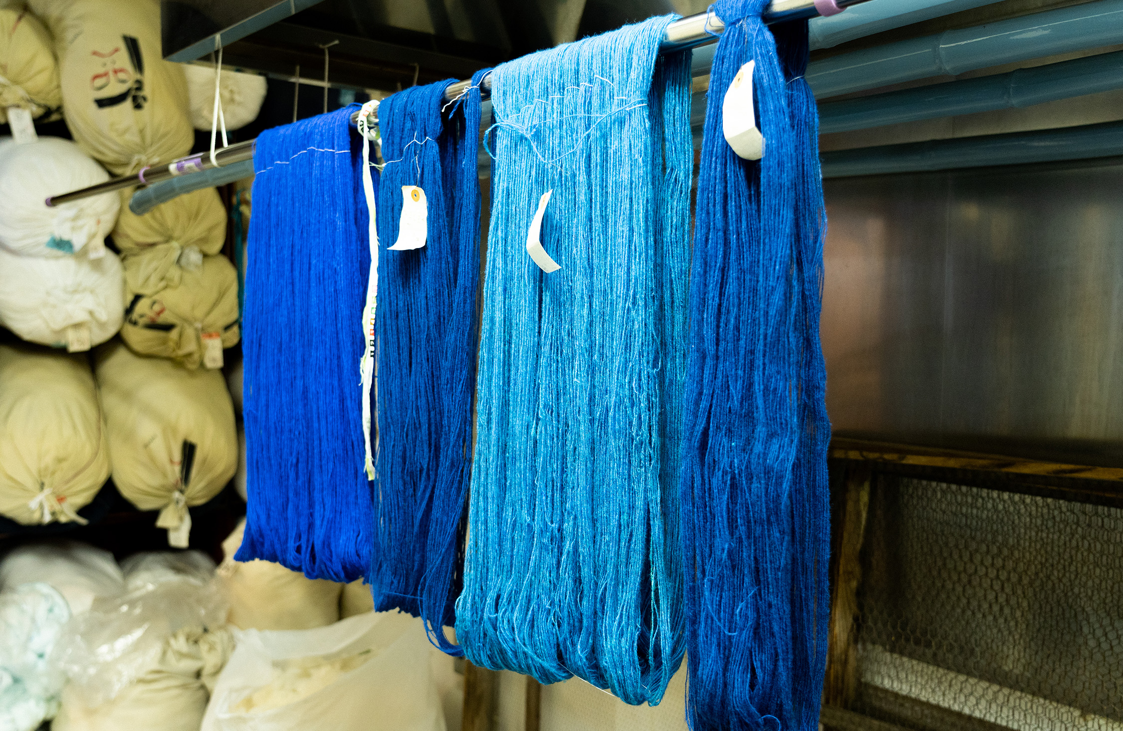 近くにかけてある糸に目をやる。深くて渋みがある濃い青や、雨の日を連想させるような水色。確かに角度によって白っぽくも見えるし、艶やかにも見える。