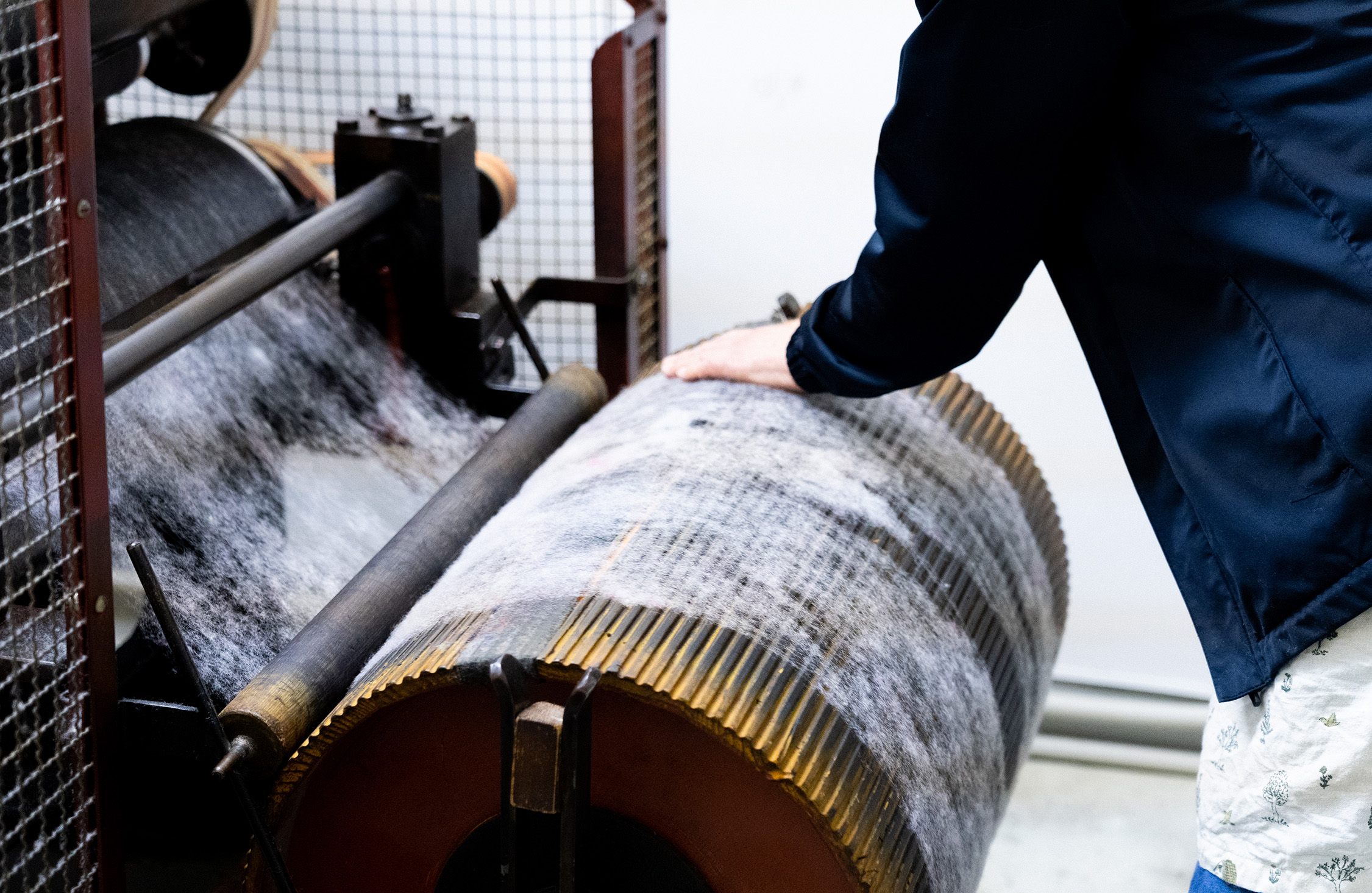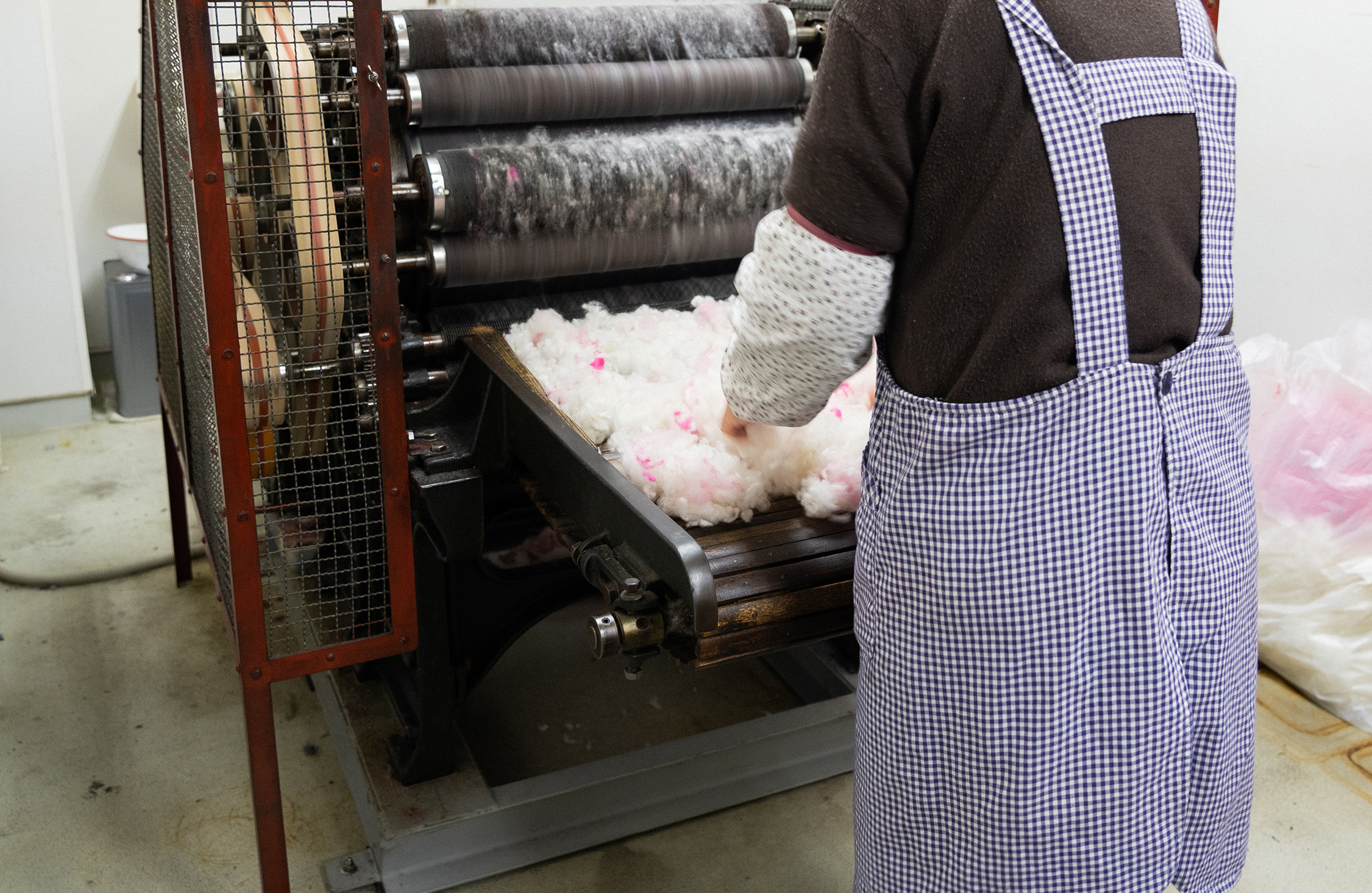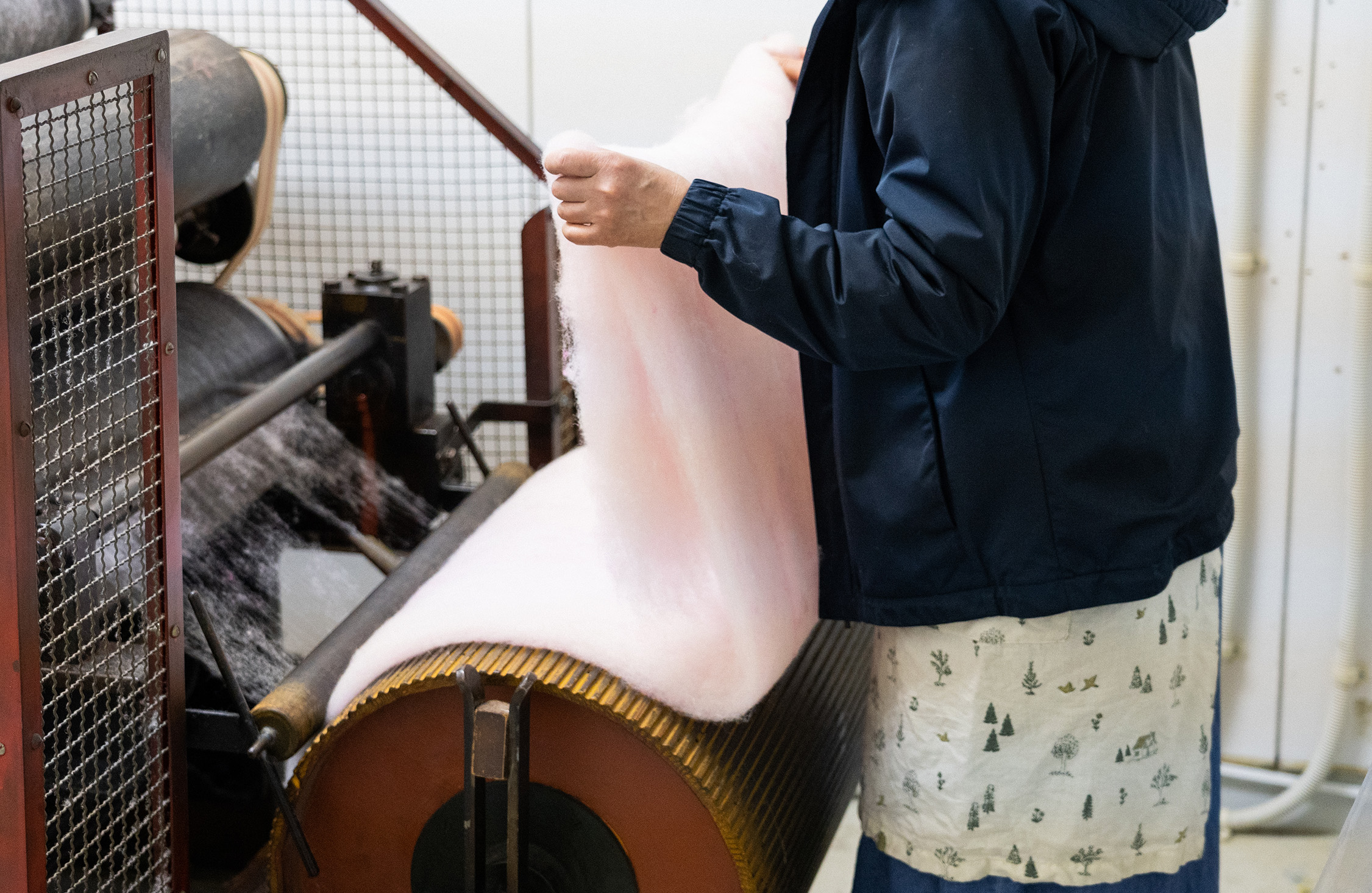 奥に進むと、カード機と呼ばれる大きなローラー付きの機械があった。機械の前後に、それぞれ人が立っている。ここから、「カーディング」という作業に入る。