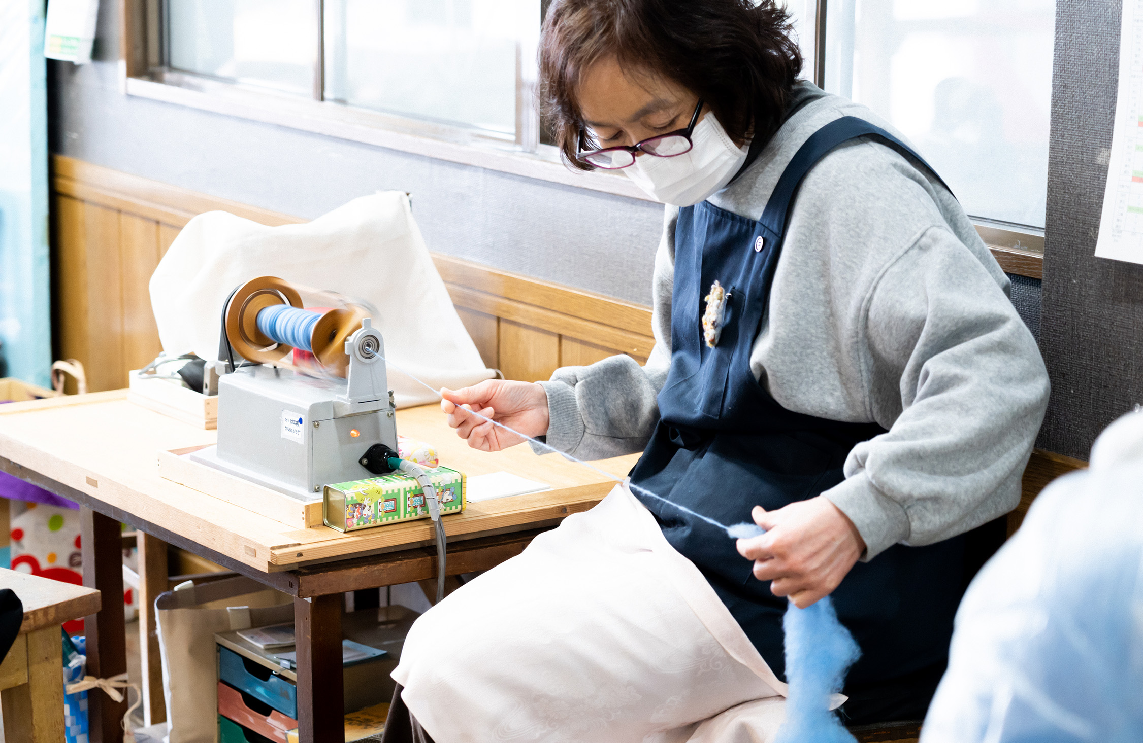 カーディングした羊毛から繊維を引っ張り出し、機械で回転をかけてねじり合わせながら1本の糸にしていく。これを「撚り(より)をかける」という。