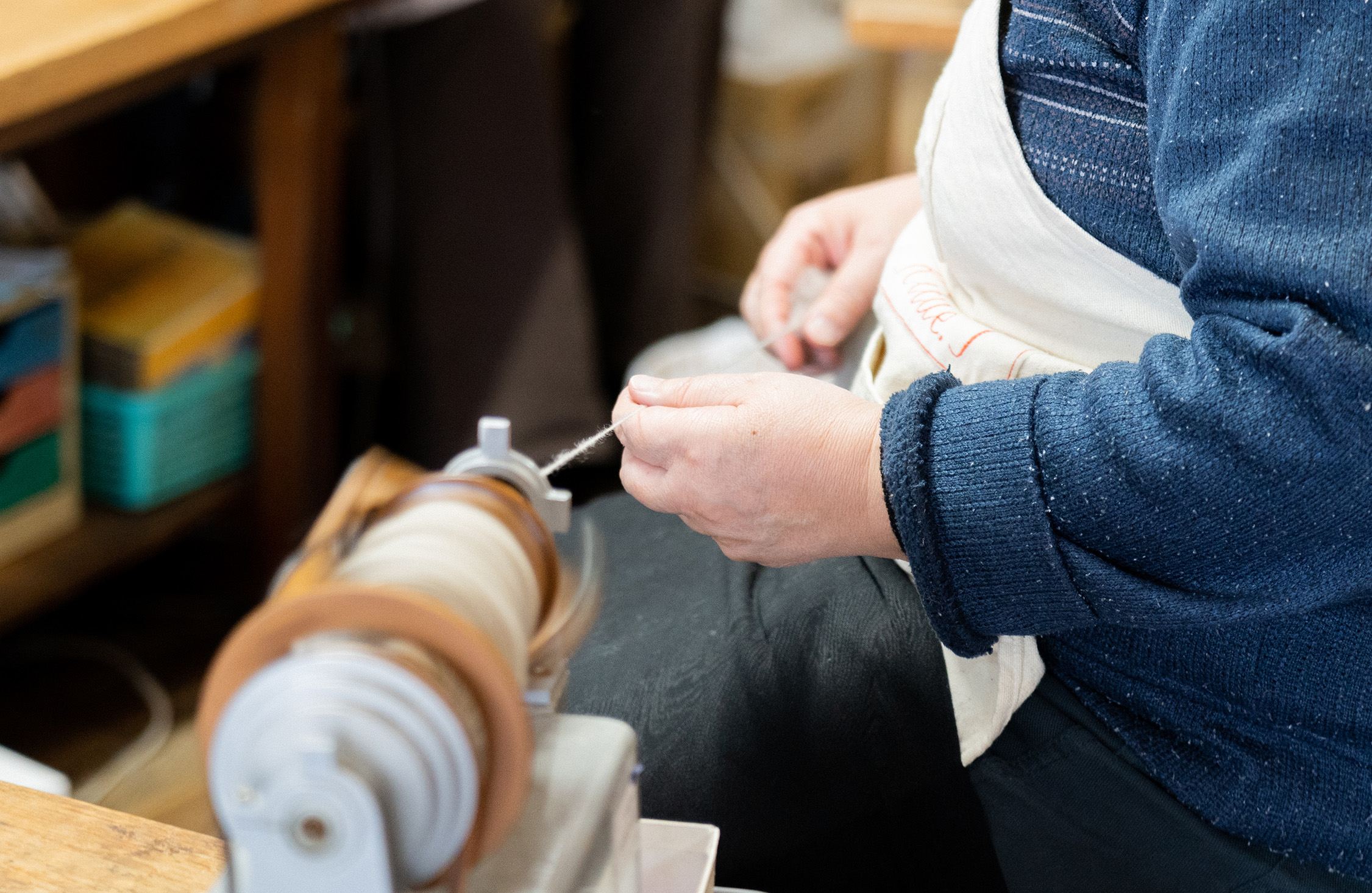「そうですねぇ、もちろん個人差はあるけれど半年くらいはかかるかなぁ。やっぱり最初は糸が太くなったり細くなったり、ボコボコになったりします。整えようとして時間をかけると、撚りがかかりすぎて糸が固くなっちゃうし。指の押さえ方や引き具合で太さを調節する、かつ指定した重さの糸に紡ぐのは高度な技術です。みなさんが指定通りの軽い糸に紡いでくれるから、製品の軽さを実現できるんです」