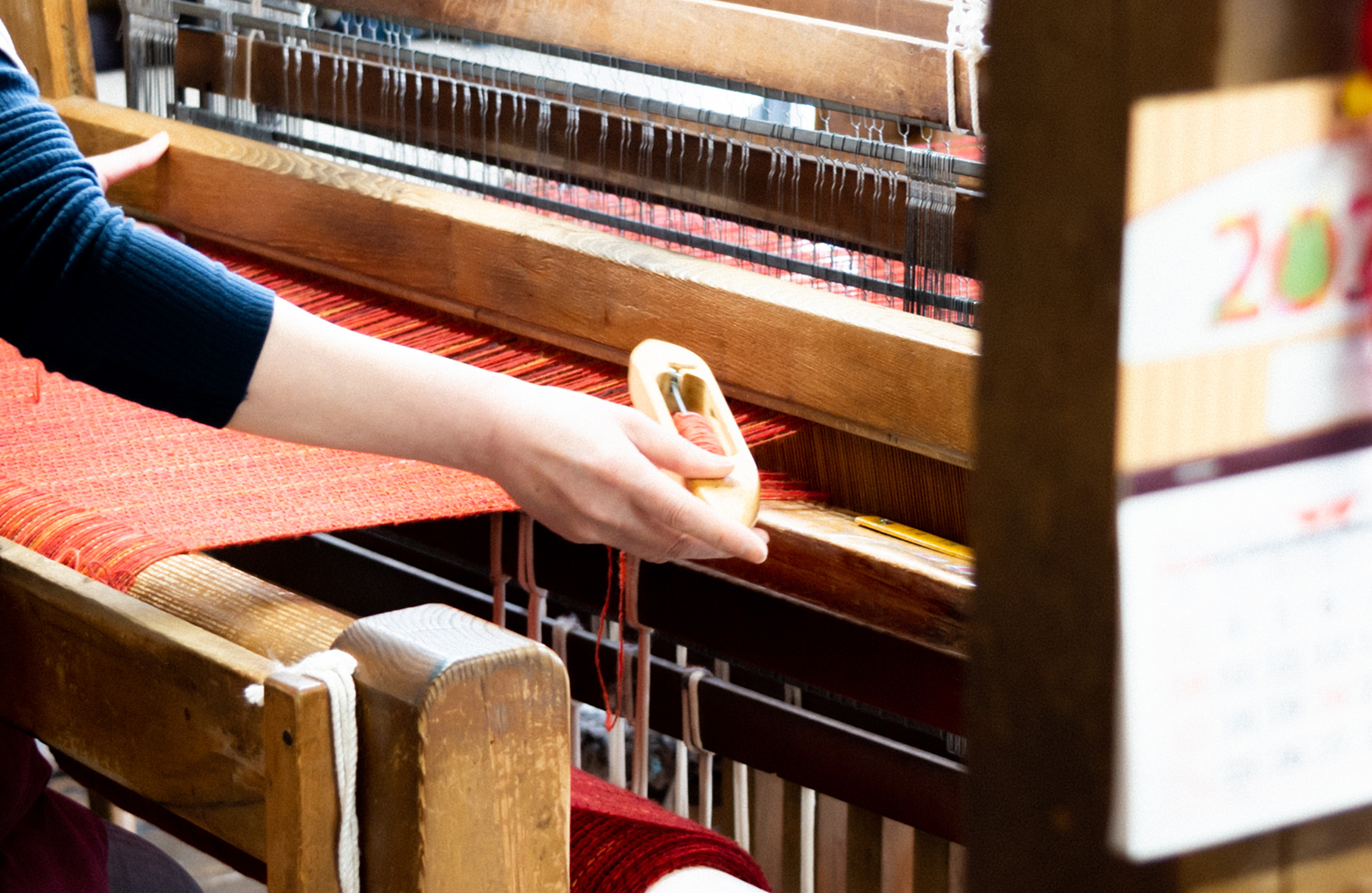 その後、作り手がひとりで一段ずつ緯糸を通し、織り上げていく。緯糸を通すのに使われるのは、「杼(ひ)」と呼ばれる木製の道具。