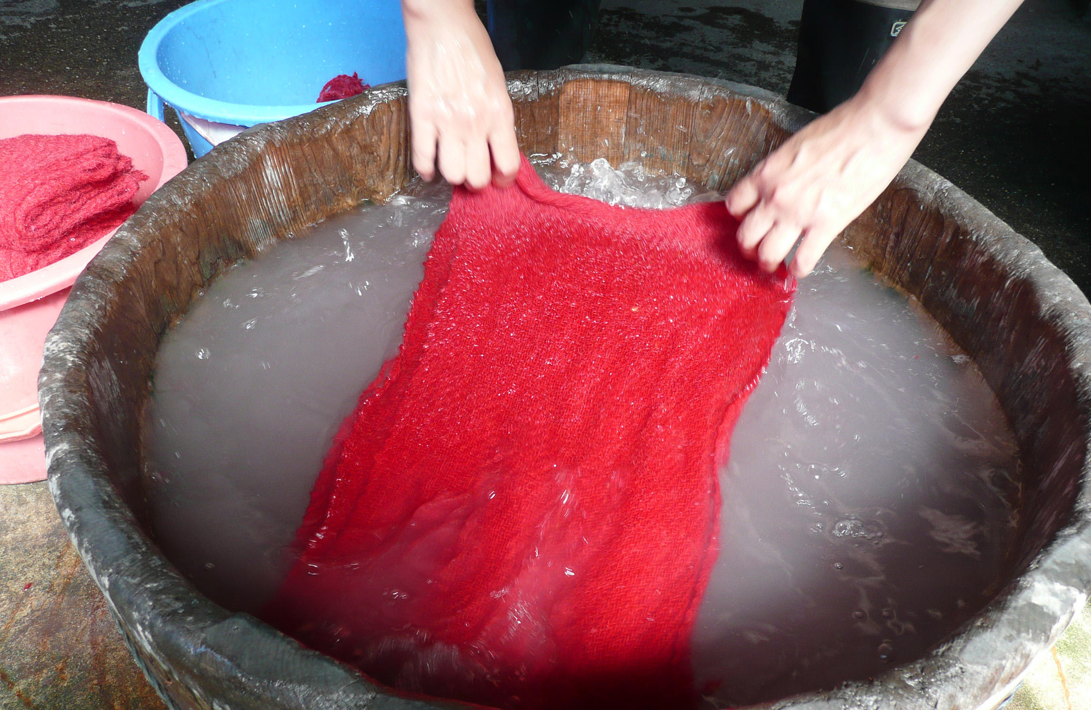 織り終えたものは、桶で一枚ずつ手洗いをする。「縮絨(しゅくじゅう)」と呼ばれる仕上げ作業だ。