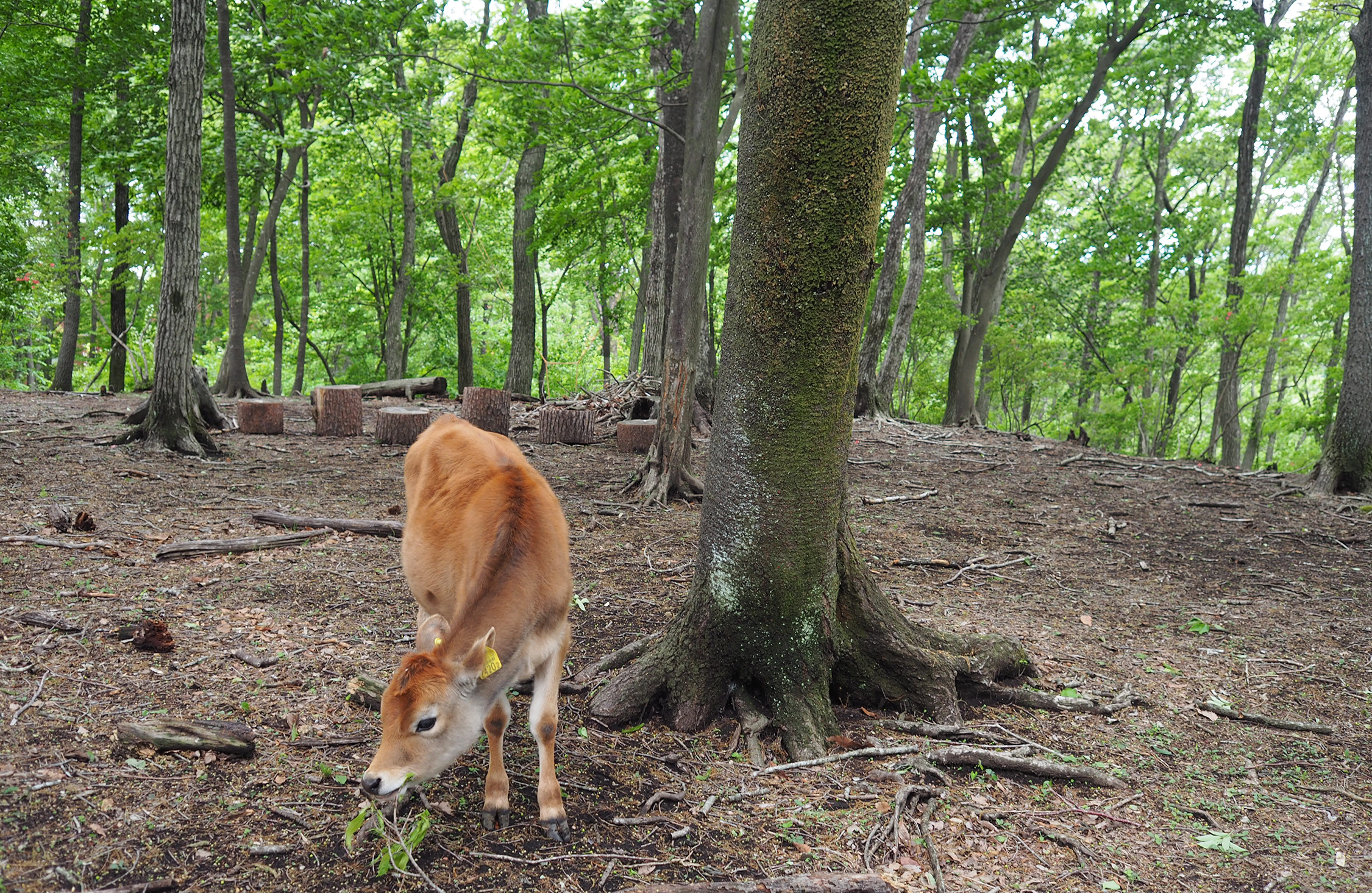 約8ヘクタール(東京ドームで換算すると約1.7個分)の牧場で放牧されている牛たちは、一頭、一頭、名前で呼ばれている。牧場はなだらかな丘にあり、森を切り拓いた放牧地の一部は、来場者に解放されている。僕が訪ねた日も、今年生まれたばかりの子牛が森のなかで気ままに過ごしていた。