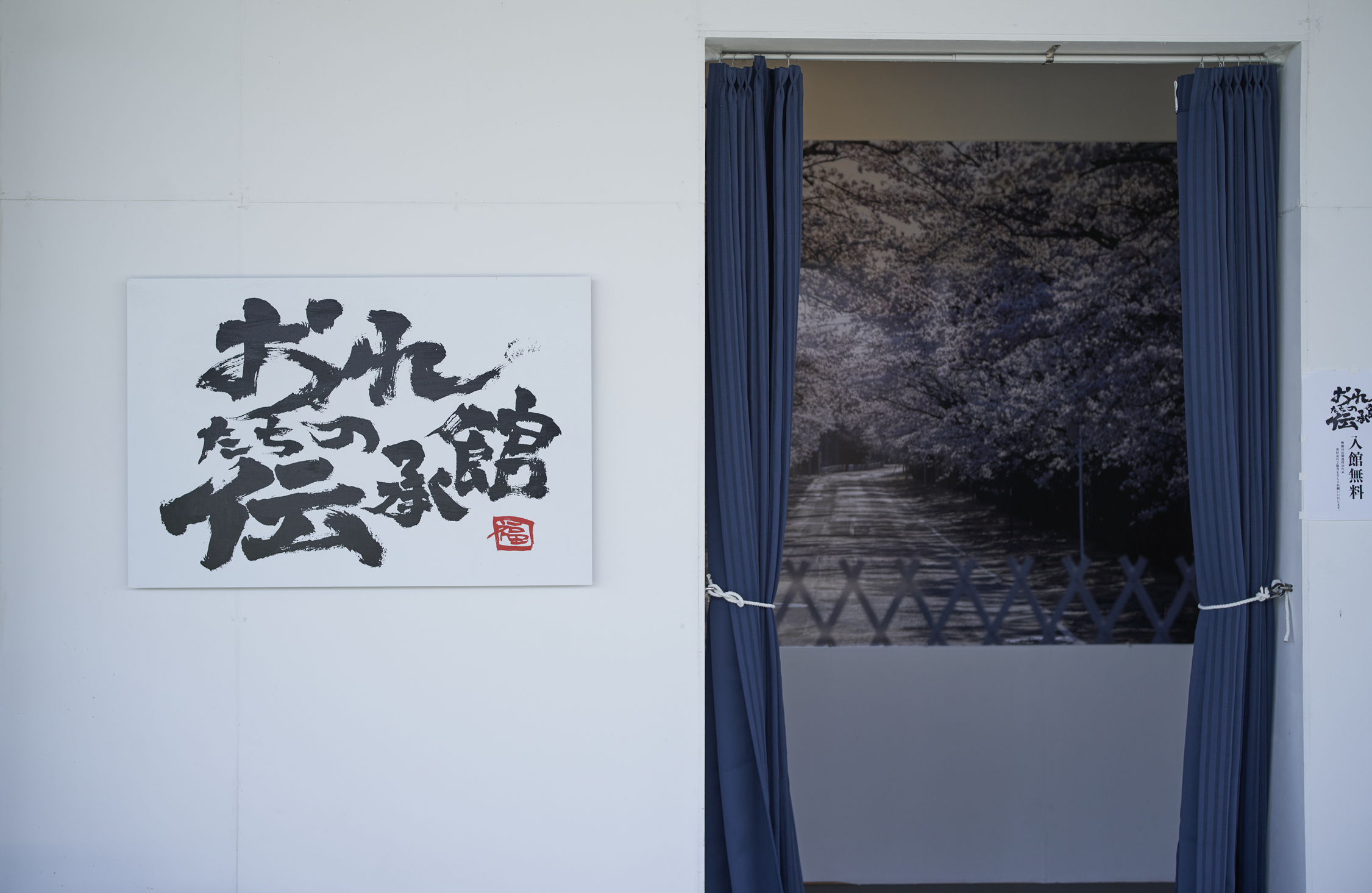 入り口の看板には、大胆な筆使いの文字で「おれたちの伝承館」とある。「伝」の文字がひときわ大きい。ここは、震災と原発事故の記憶を伝える小さなアートミュージアム。庇の下ではひとりの男性がタバコを吸っていた。
