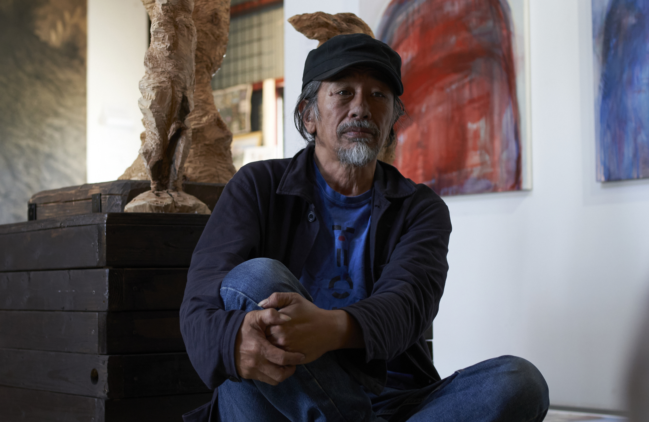 建物の内部は薄暗く、入り口には満開の桜の写真が迎えてくれる。その奥には本物のバリケードが置いてある。天井の高い空間の中心にあるのは、巨大な手を天に向かって突き上げているような無骨な立体作品だ。中筋さんはその前に座り、話をはじめた。