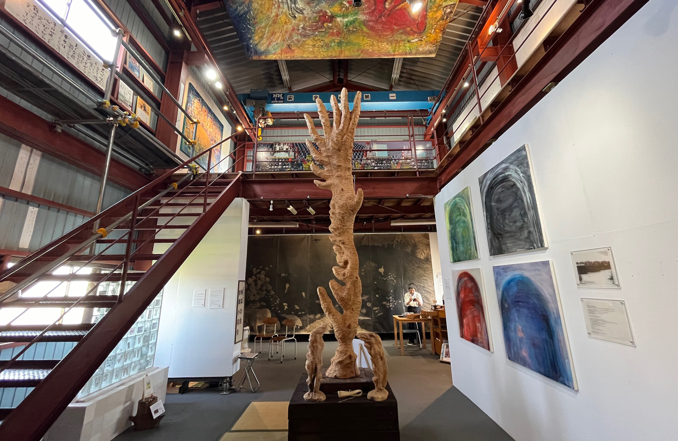 「いわきの久ノ浜で被災し、津波で一切合切が流されてしまった安藤榮作さんの作品で、鳳凰の翼を表してる。安藤さんは、震災後に必ずまた蘇るという意味で不死鳥の作品をいくつか作っていて、この場所をはじめる時に鳳凰がうちに来てくれないかなって思っていたら、願った通りになって。鳳凰の翼が福島の浜通りに帰ってきたんだ」