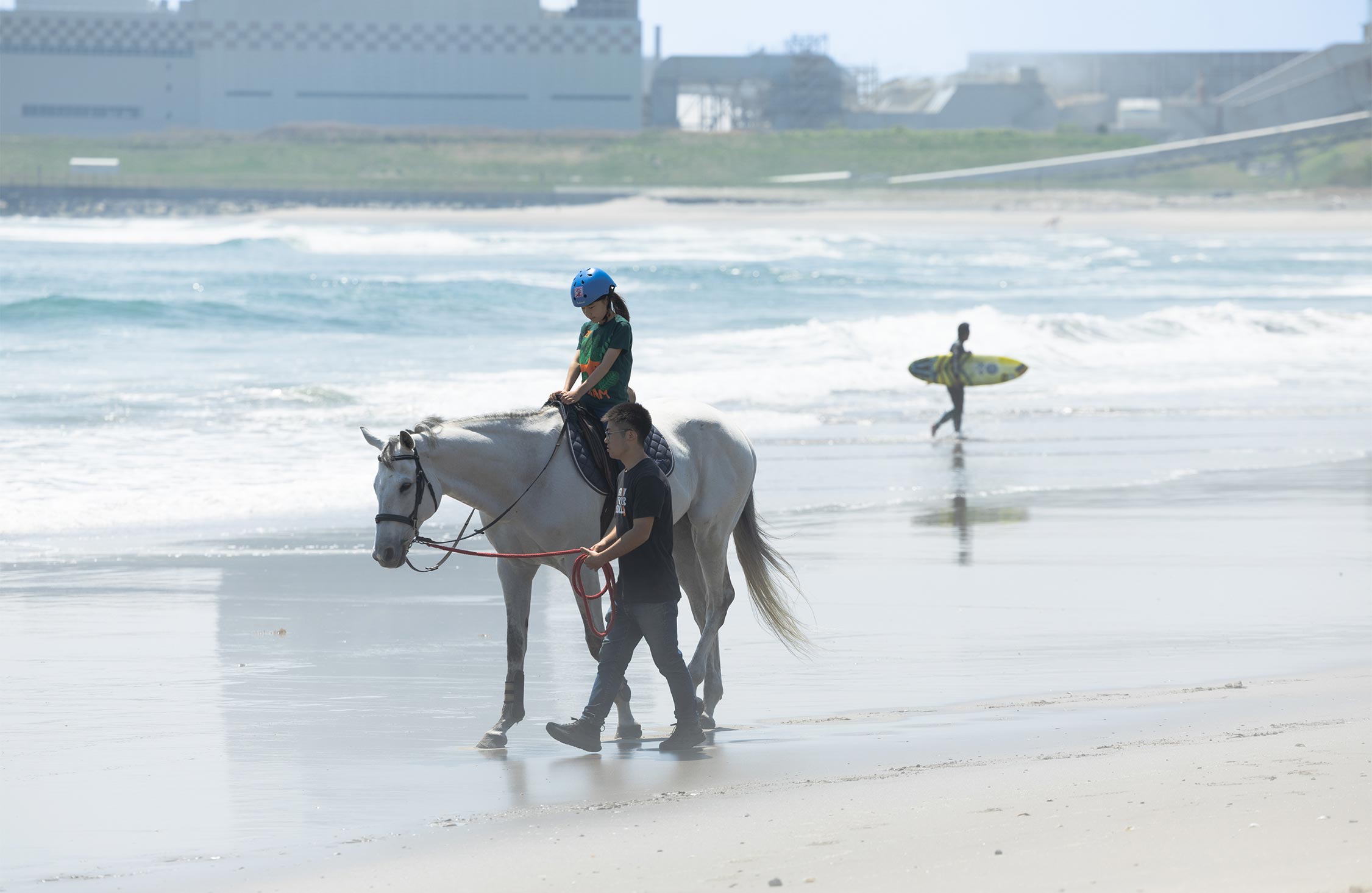 たまに立ち止まりながらも、なんとかスタート地点に戻ったワタリン。周りには波乗りを終えて、着替えをするサーファーたち。みんな、馬が通ればふと目を上げて微笑んだり、眺めたりするけれど、あくまで日常にある光景。馬とサーファーの画は、ほかでは見られないものだろう。
