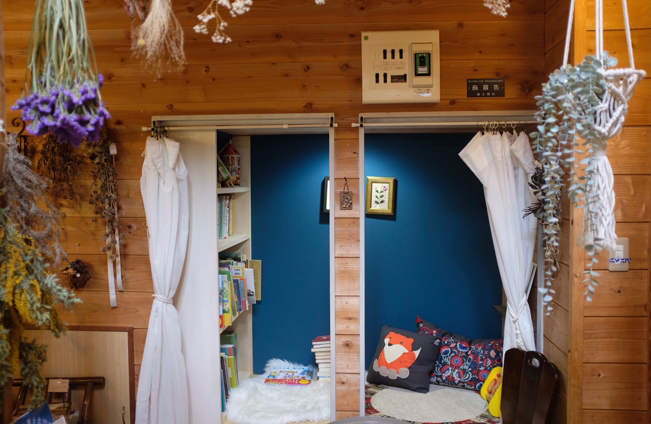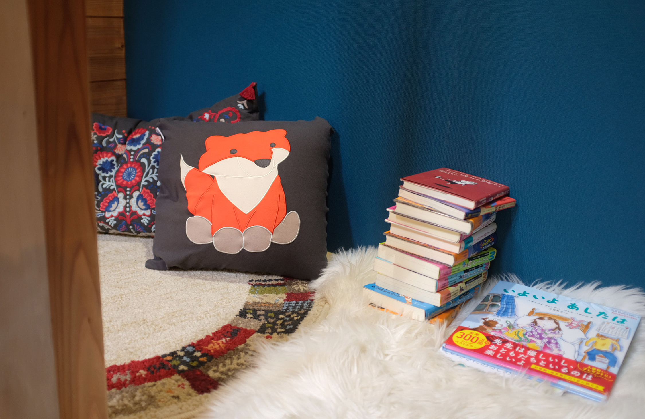 奥には子どもがすっぽりと入って本を読める、秘密基地のようなスペース。喫茶やランチが食べられるカウンターもあって、本を売る店だけど、本をじっくり読む時間を提供できるように心を込めて考えられた店でもあることが伝わってくる。