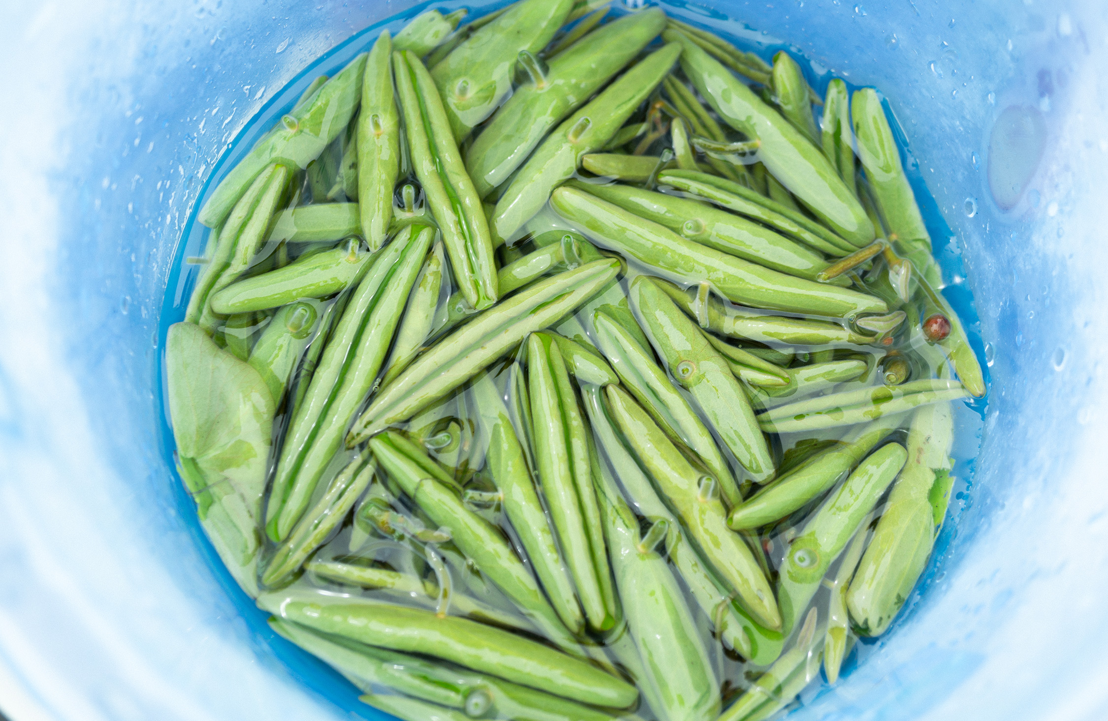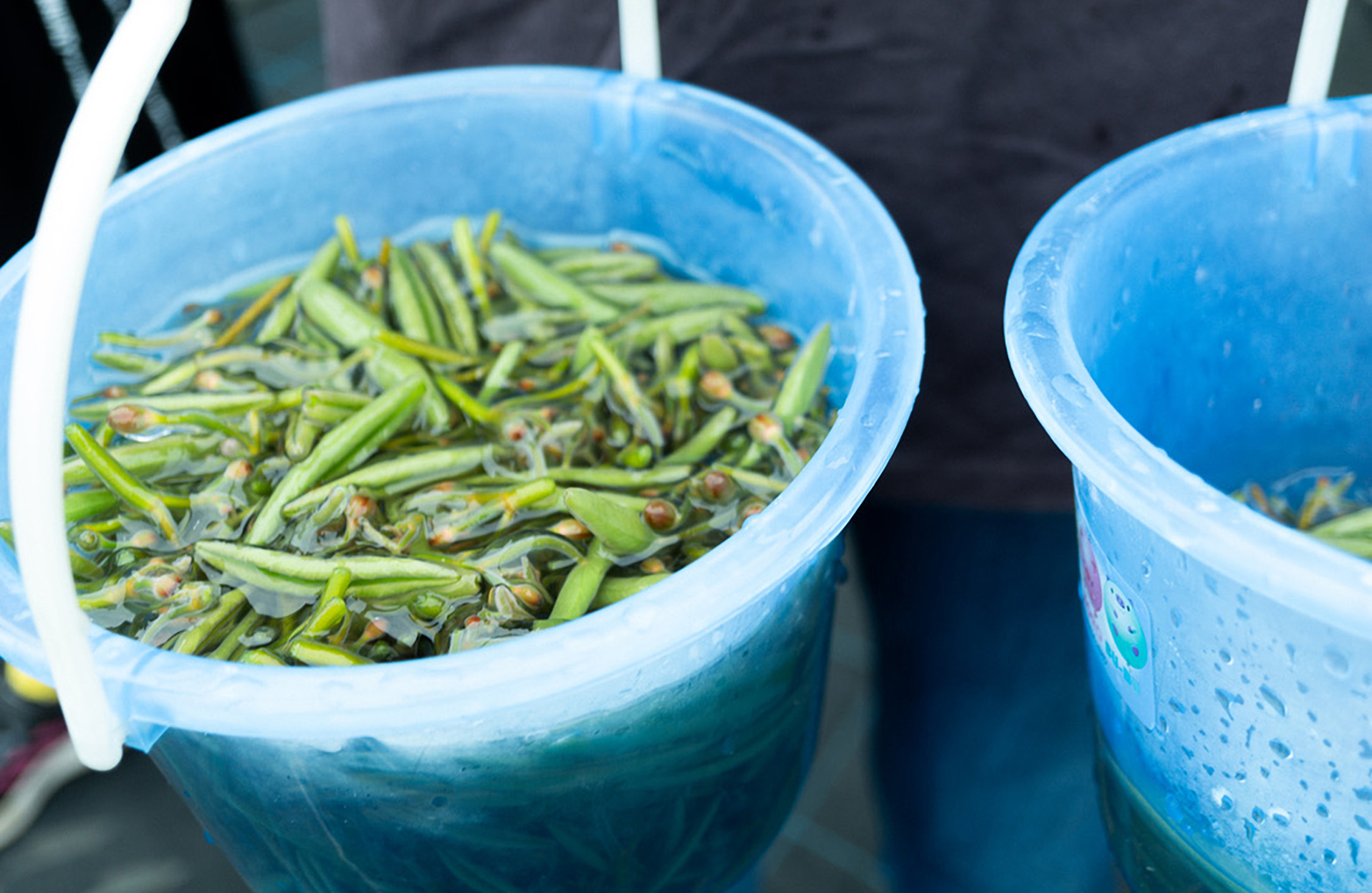 1時間後、大会終了。各自が手持ちの棒で舟を操作し、スタート地点に戻る。参加者はじゅんさいを入れたバケツを持ち、計量する。結局、僕のバケツは半分にも満たなかった。ほかの人はどんな感じかな? と思って後ろを見ると、子ども連れのお母さんがバケツをふたつ持っている。とんでもない量だ! 思わず、話しかけた。
