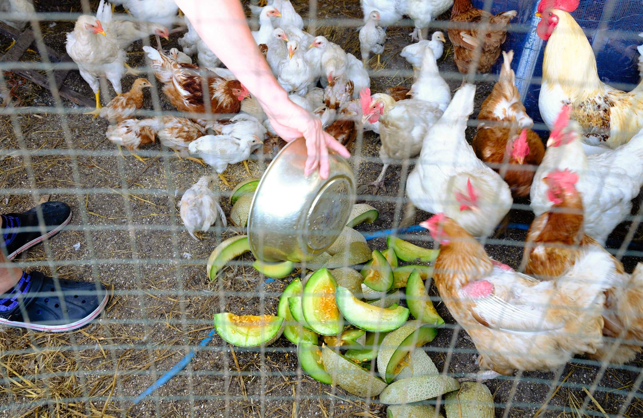 「エルム・オン・ザ・ビーチ」の朝は、ニワトリの鳴き声ではじまる。朝一番にクリスさんといっしょに、ニワトリに餌をあげるのは蕾羅くんの仕事だ。今日の餌はなんと、メロン農家である友達からもらったという大量のメロン。たくさんのメロンが入った大きなボールを抱えて、家と鶏小屋を何往復もする蕾羅くん。あたりには甘い香りが漂い、ニワトリにしては、なんとも豪華すぎる朝ごはんである。