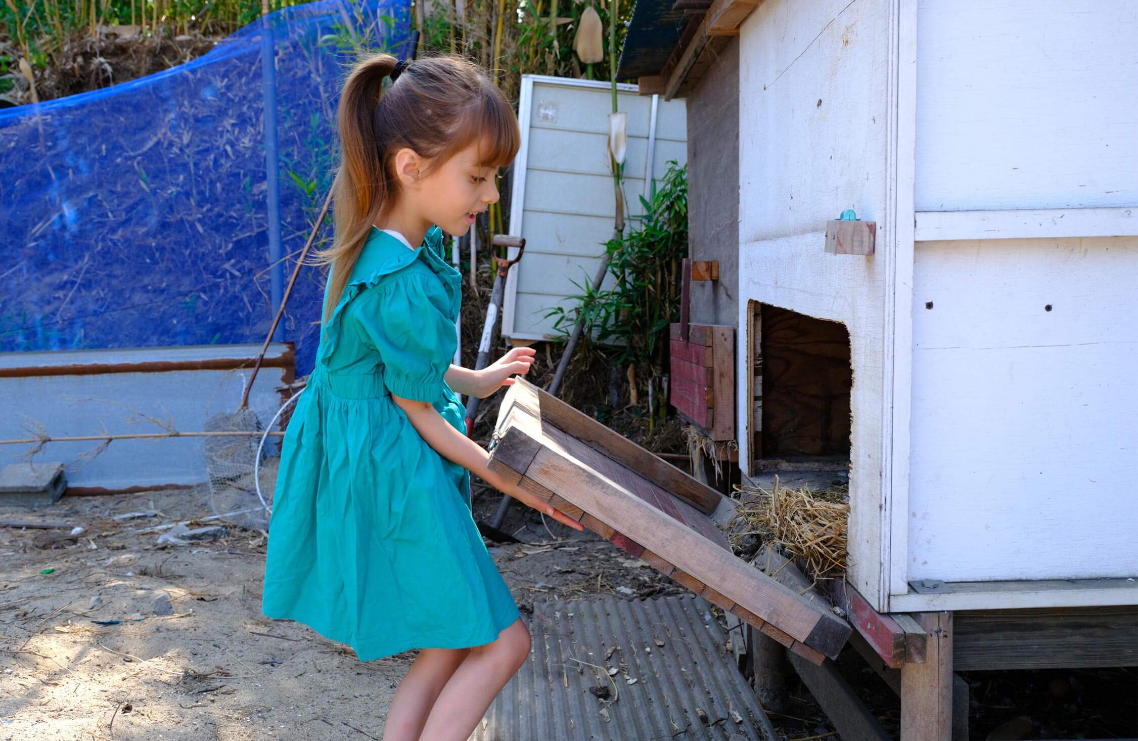 愛梨杏ちゃんが「ほら、見て!」と鶏小屋にある小さな扉を開けてくれた。中にはきれいな卵が並んでいる。うみたての卵を触ると、ほんのりと温かい。