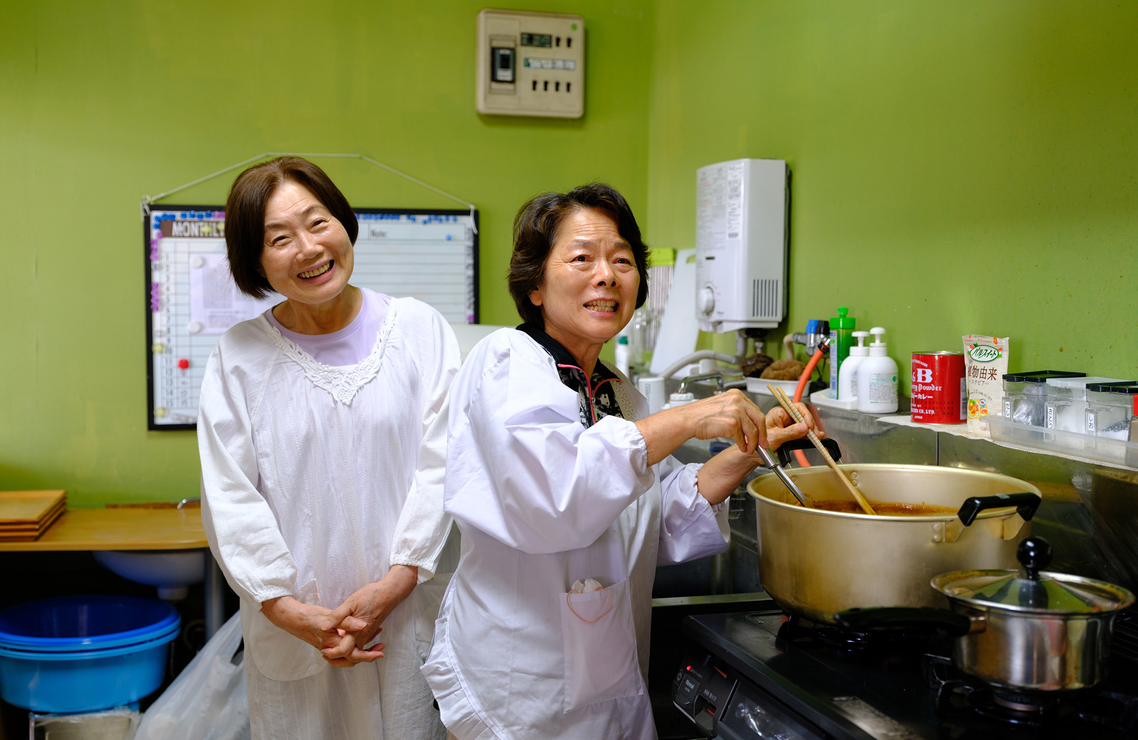 そしてここの食事をつくるのは、地域のボランティアが中心だ。70代や80代になる女性も多く、つまり小笠原さんの親世代の人たちだ。この日も厨房では、外山さんと大島さんが、楽しそうに50人分のカレーを仕込んでいた。二人ともとても若々しくて、年齢どおりには見えない。