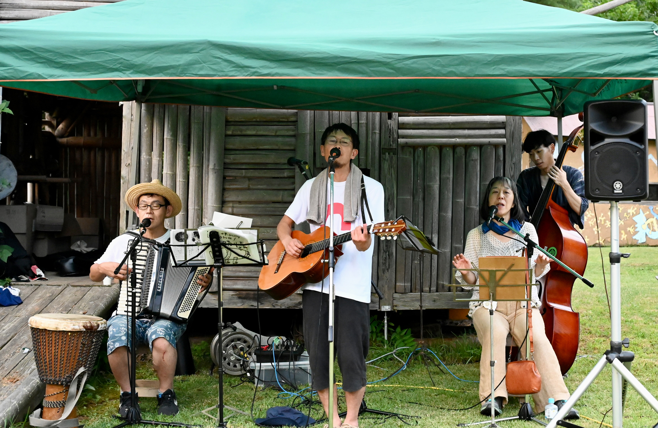 高校生の頃から読書の森の常連だというタクちゃんのウッドベースが、音に厚みを添える。和太鼓を叩くのはデンマークから滞在しているサリー。