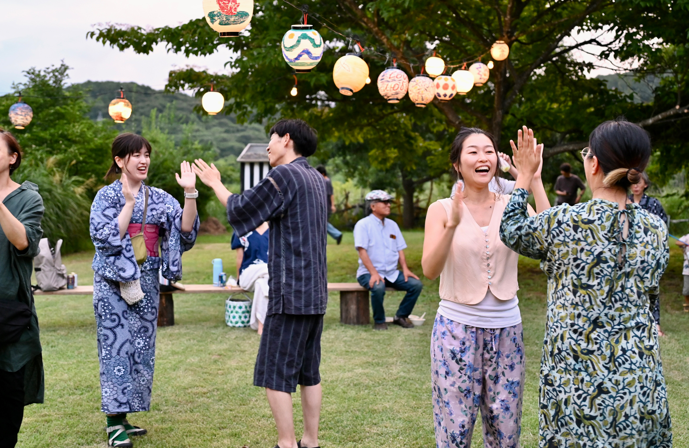 そこからさらに少し登り、手作りの行灯に導かれながら野原を通り抜けると、広々とした丘に手づくりの櫓が設置され、イラストが描かれた提灯が風に踊っていた。