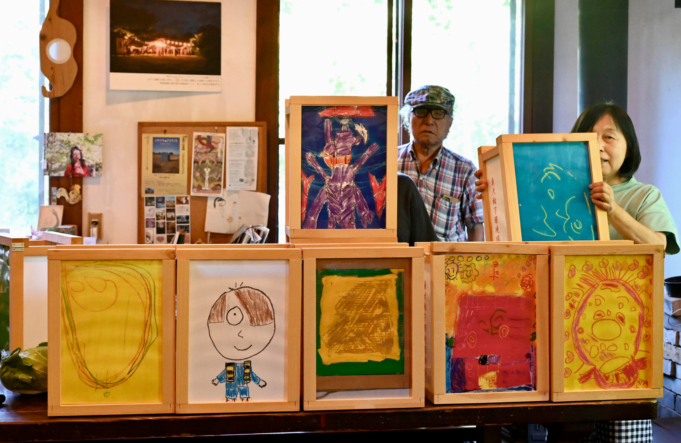 話を聞いている最中、埼玉から来たという東出さん夫婦がカラフルな行灯をどっさり運び込んできた。夫の東出五国さんは日本におけるケーナの草分け的演奏者であり、絵も描く人だ。展覧会やケーナのイベントを通じて夫婦で読書の森に通うようになったという。今年は妻の美知子さんが、関わりのある障害者たちの絵を行灯にして盆フェスの小道を照らせないかと試行錯誤し、初めて実現した。