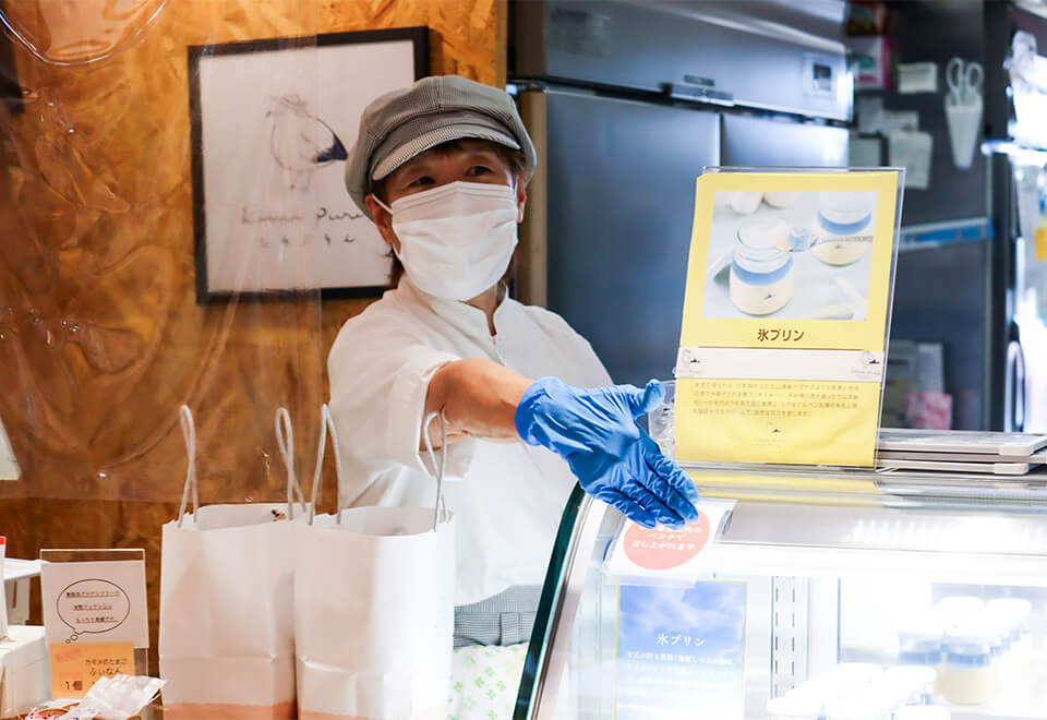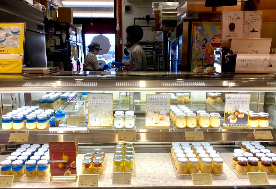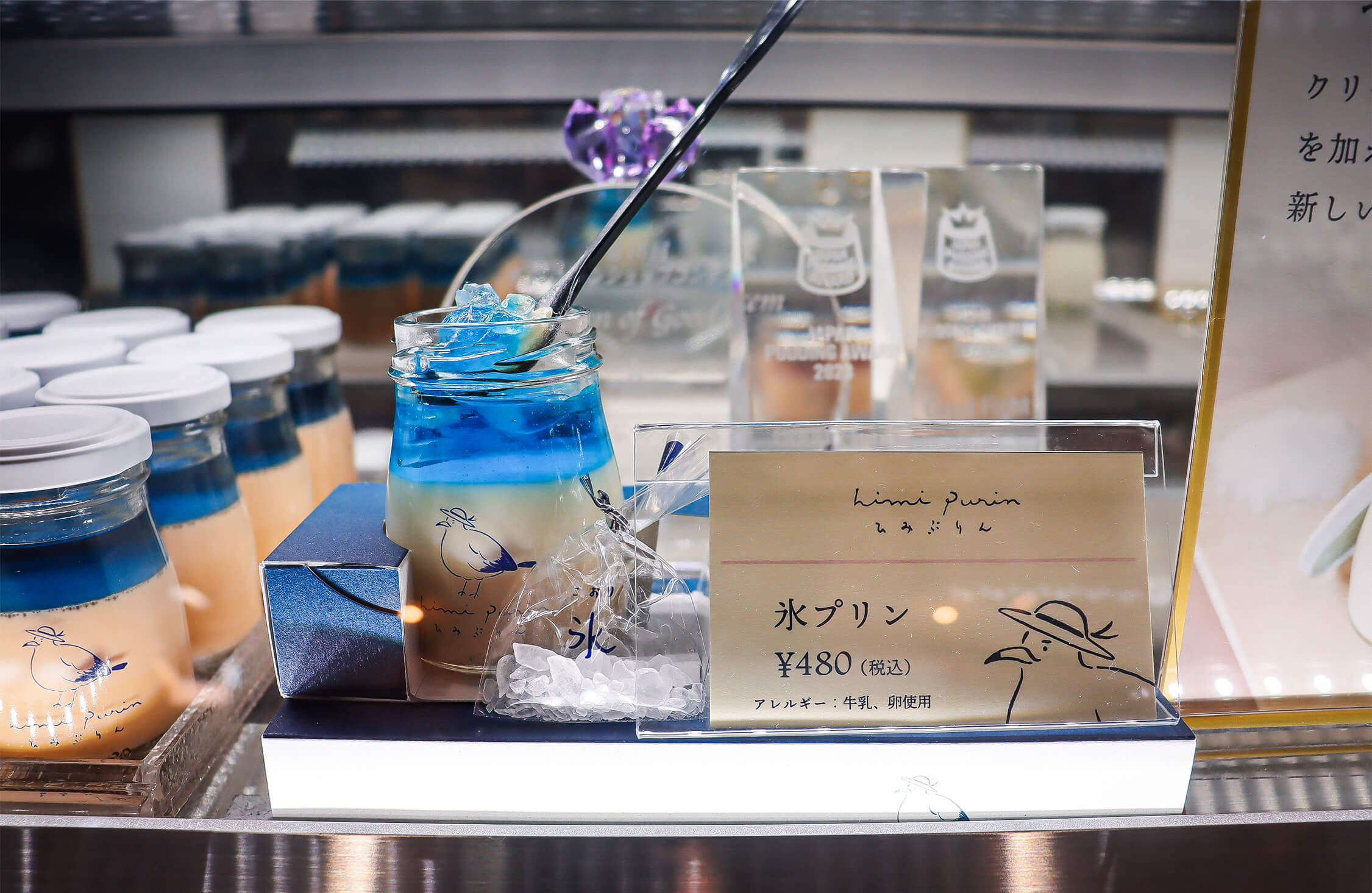 取材時間より早く到着したため、プリンをいただくことにする。ひみぷりんのショーケースには、氷プリンの他に塩チーズプリン、なめらかプリン、塩キャラメルプリン、シャインマスカット、いちじくプリンが並んでいる。ラインナップは季節によって変わるらしい。私は、一番人気の「氷プリン」を注文した。