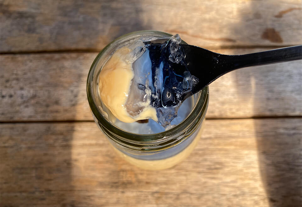 中庭に移動し、ウッドデッキに座り、氷プリンとご対面。まずは、そのままいただく。さわやかな青いジュレの下には、濃厚でトロトロなプリンが隠れている。