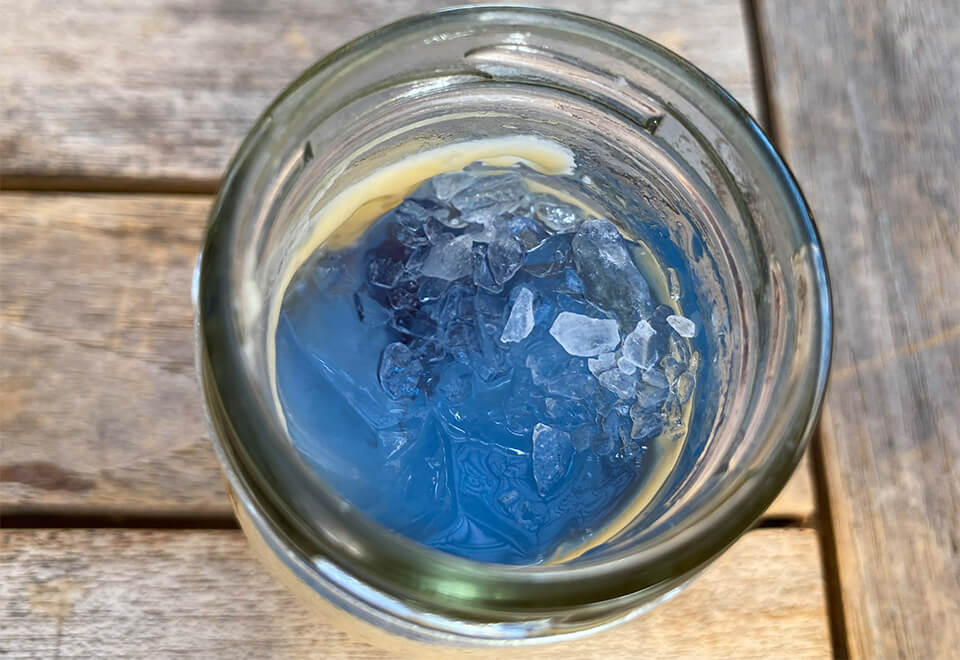 透き通るブルーのジュレが乗ったプリン。小さな袋が付いてくる。氷砂糖が中に入っていて「お好みでかけて食べてください」とのことだった。