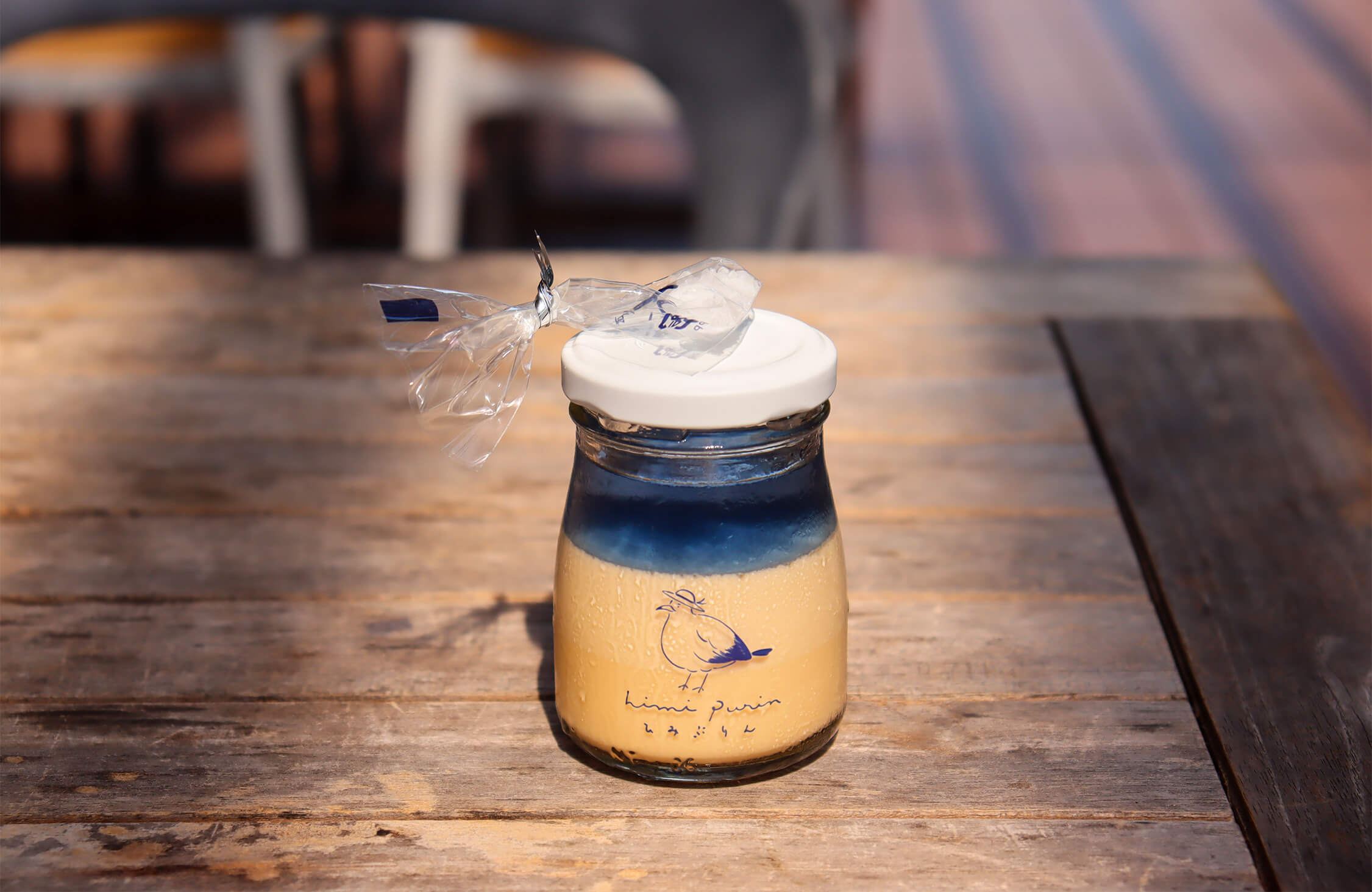 晴れ渡った日の澄んだ海のようなブルーのプリンが目を引く。
