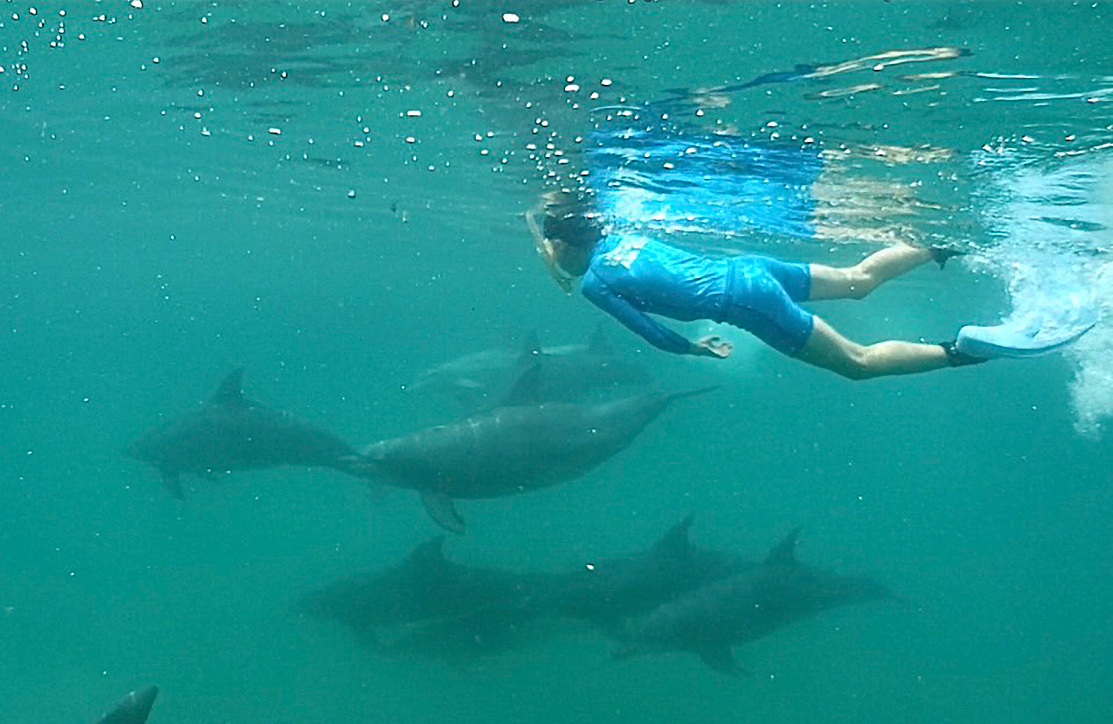 船のエンジンが止まり静かになると、イルカスイムをする参加者は、シュノーケルを装着しフィン(足ヒレ)をはいた。準備した人から次々とイルカの方向を向き、飛び込んでいく。