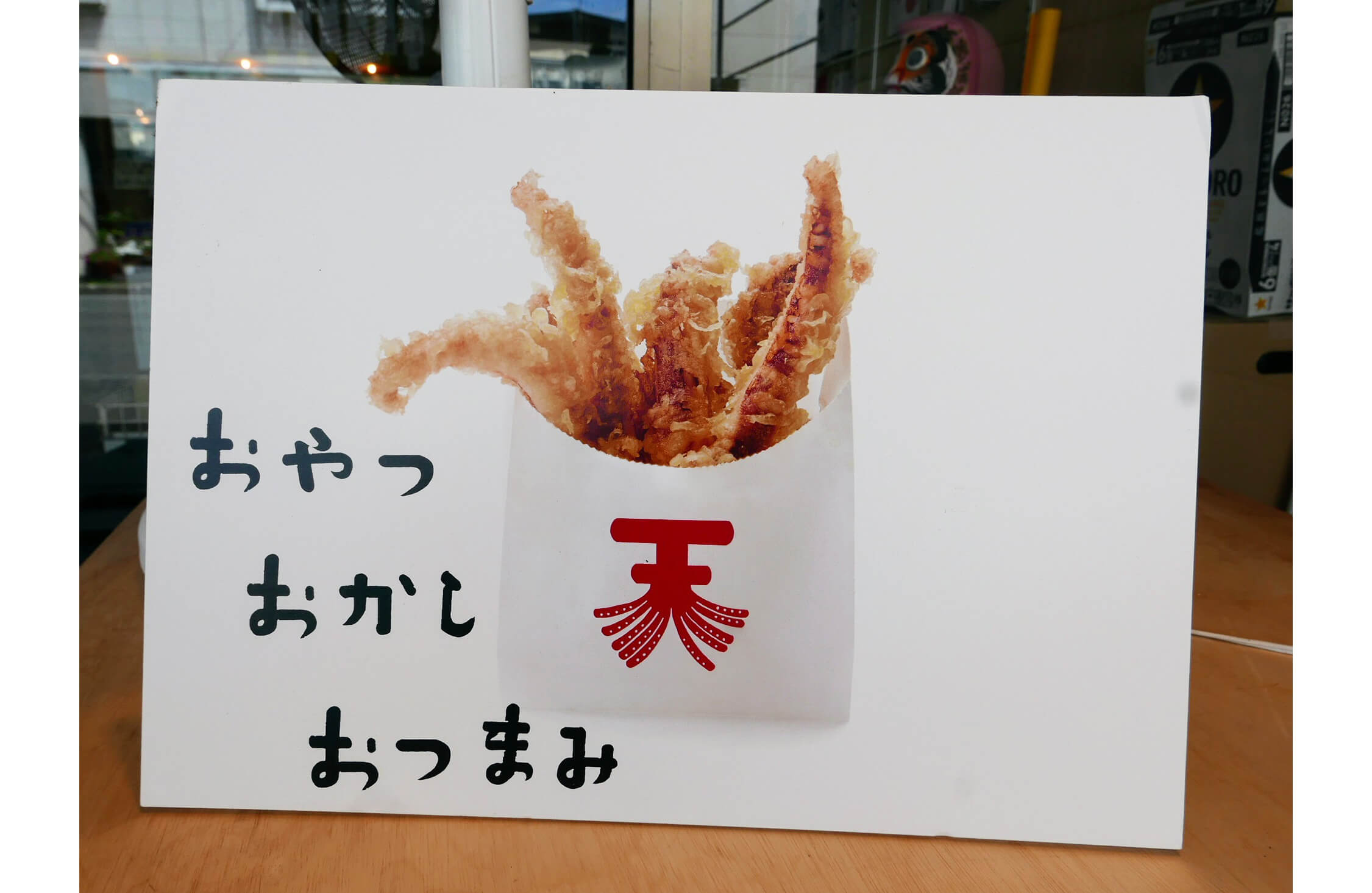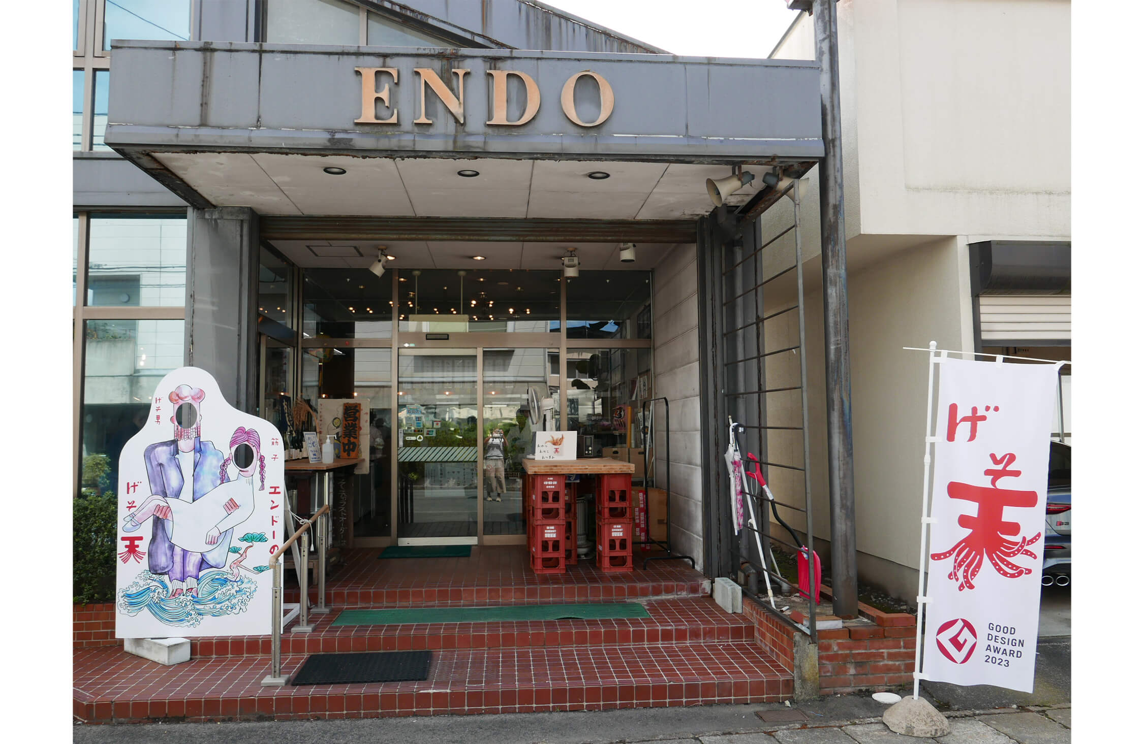 まず面食らったのは、店頭に置かれた顔はめパネル。「エンドーのゲソ天」と書かれたパネルの顔はめ場所には、「ゲソ男」と「筋子」という謎の名前が書いてある。入口の反対側にはのぼり旗。「天」の文字のイカの足が、風に吹かれてくにゃくにゃと舞っている。のぼりの下に書かれた「GOOD DESIGN AWARD 2023」のロゴが、店舗に入ろうとする人に「なんだか凄そう」と感じさせる。