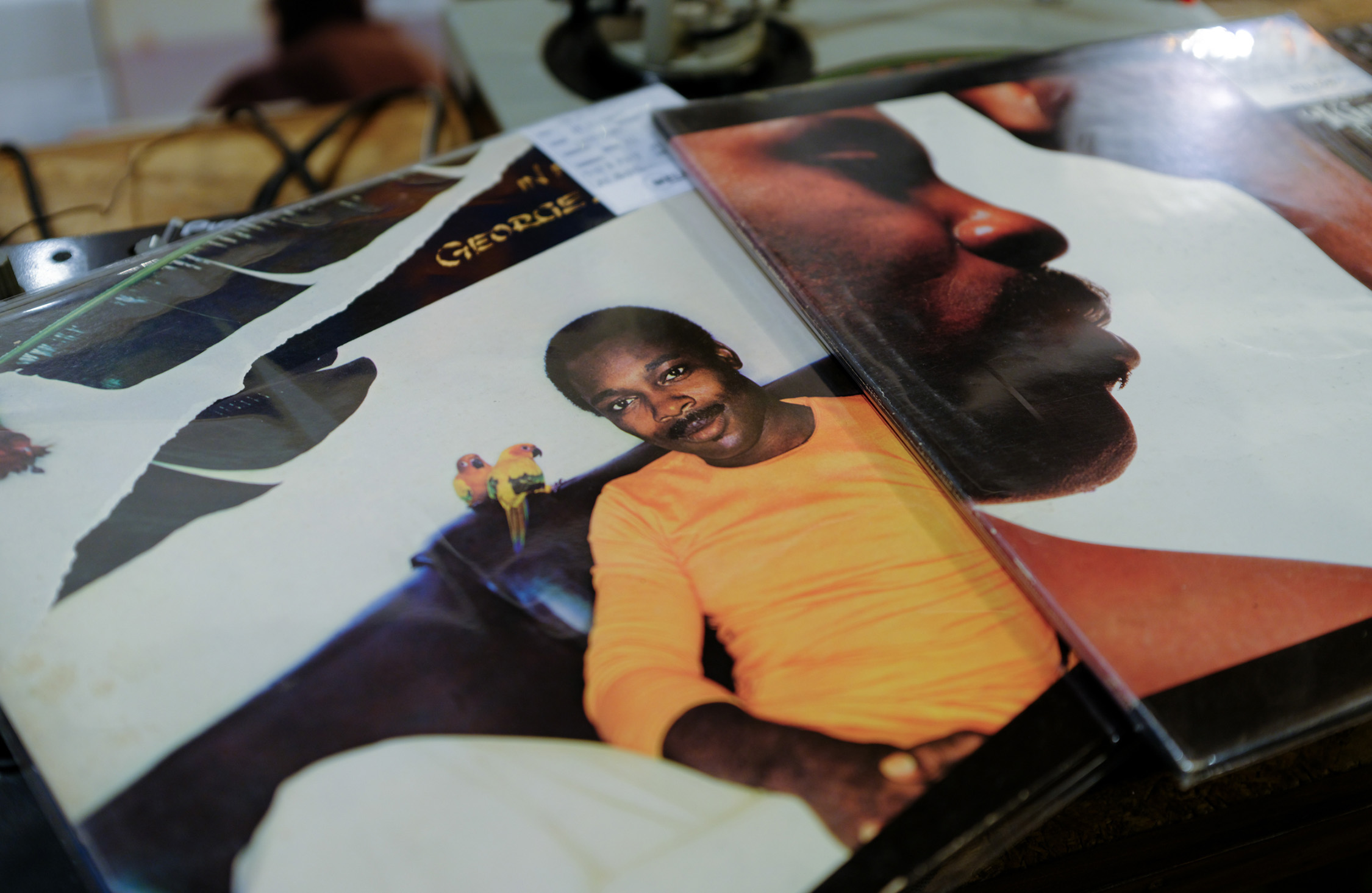 「いまレコードチェックをしていたんですよ」と、ターンテーブルの上でレコードを触りながら岡崎さんはいう。仕入れたレコードの状態が良いか、傷などがないかを調べる作業だ。
