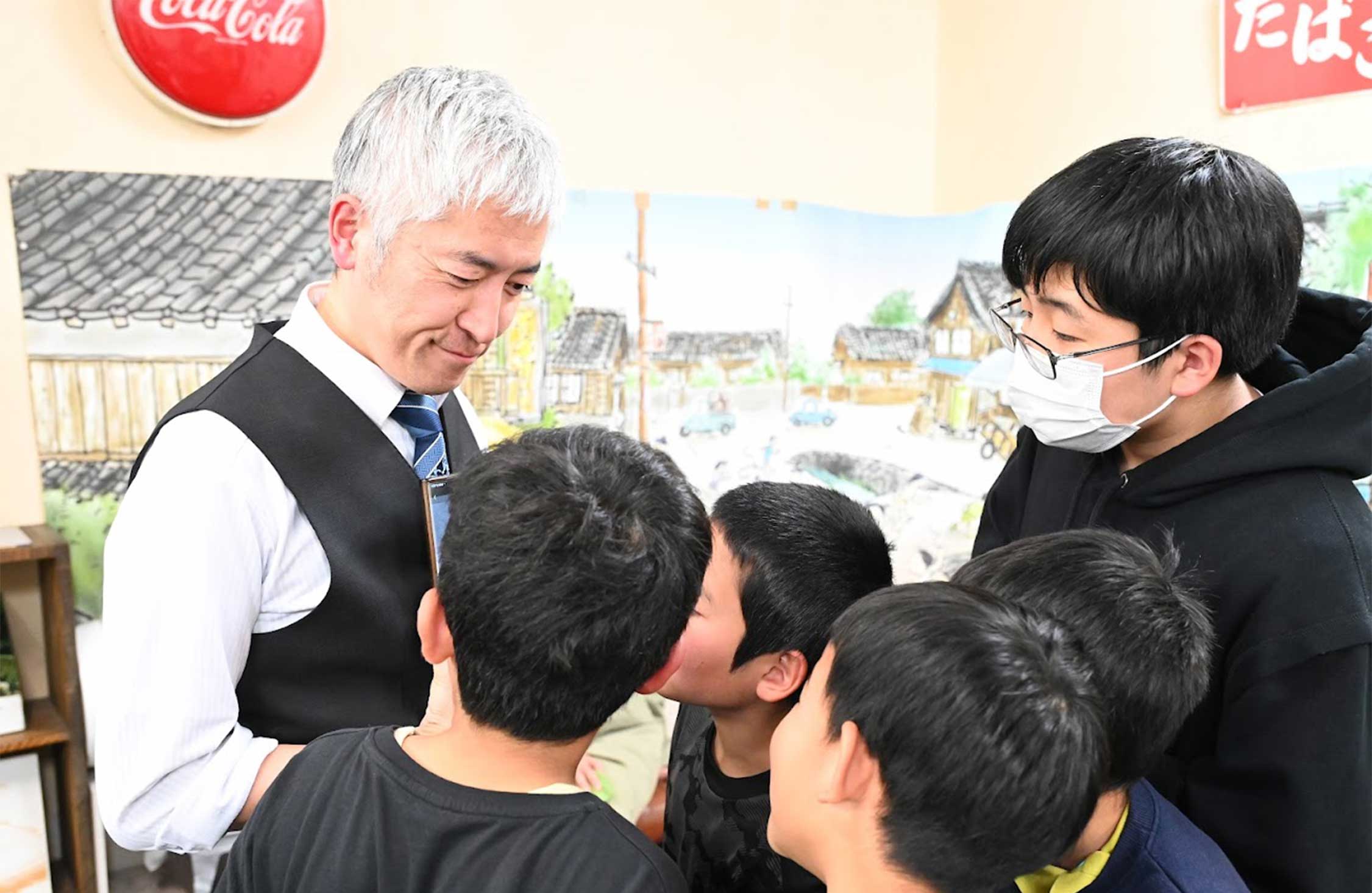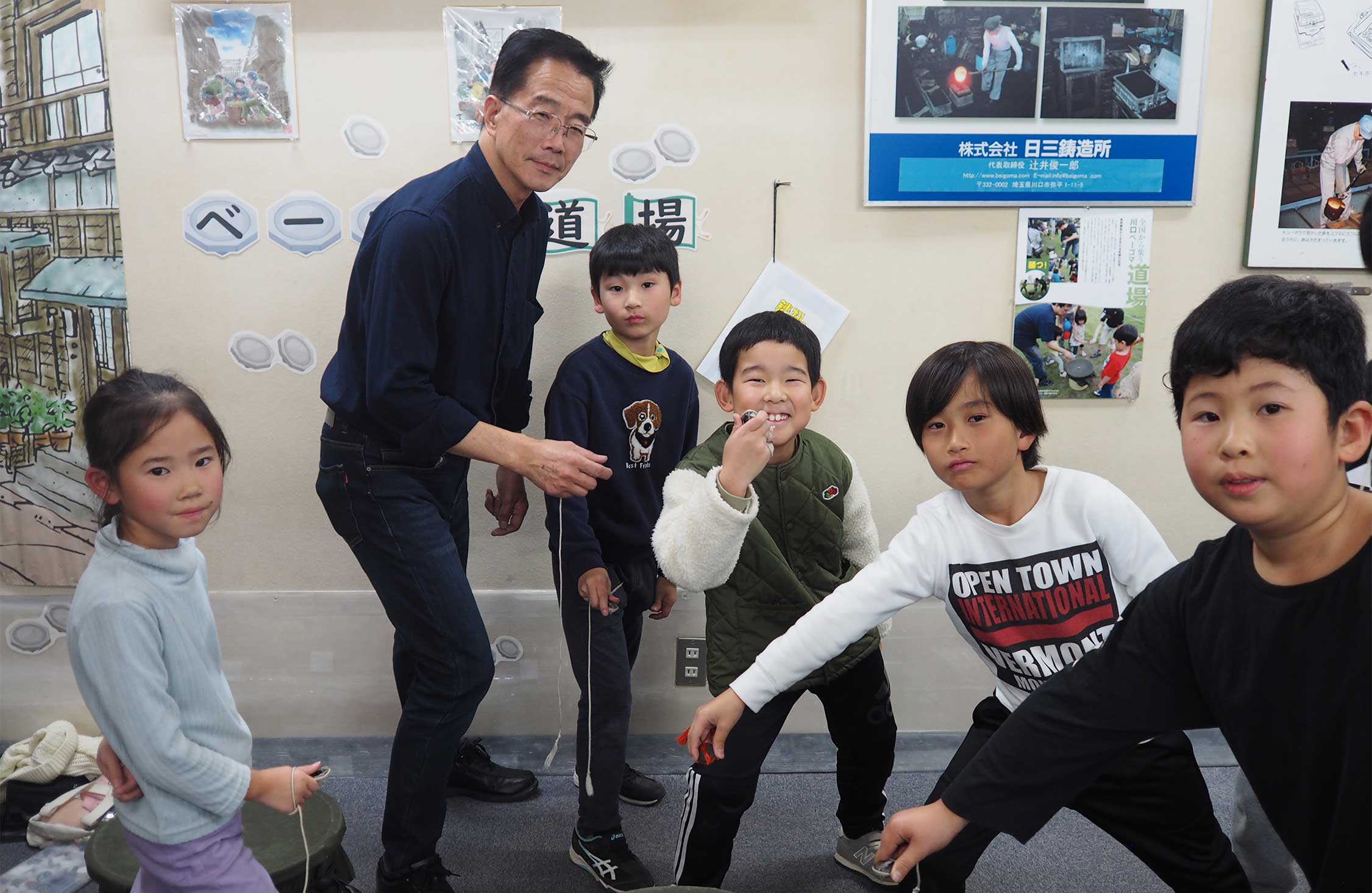郷土資料館で取材を始めて30分ほど経ったタイミングで、井出さんと中島名人が外出先から戻ってきた。ふたりは2022年秋から、市内の小学校3年生に「出前授業」で、ベーゴマを教えている。取材の日も、6時間目までベーゴマ授業が入っていたそうだ。ふたりが姿を現すと、子どもたちのテンションが一段と、いや、二段、三段と盛り上がるのがわかった。
