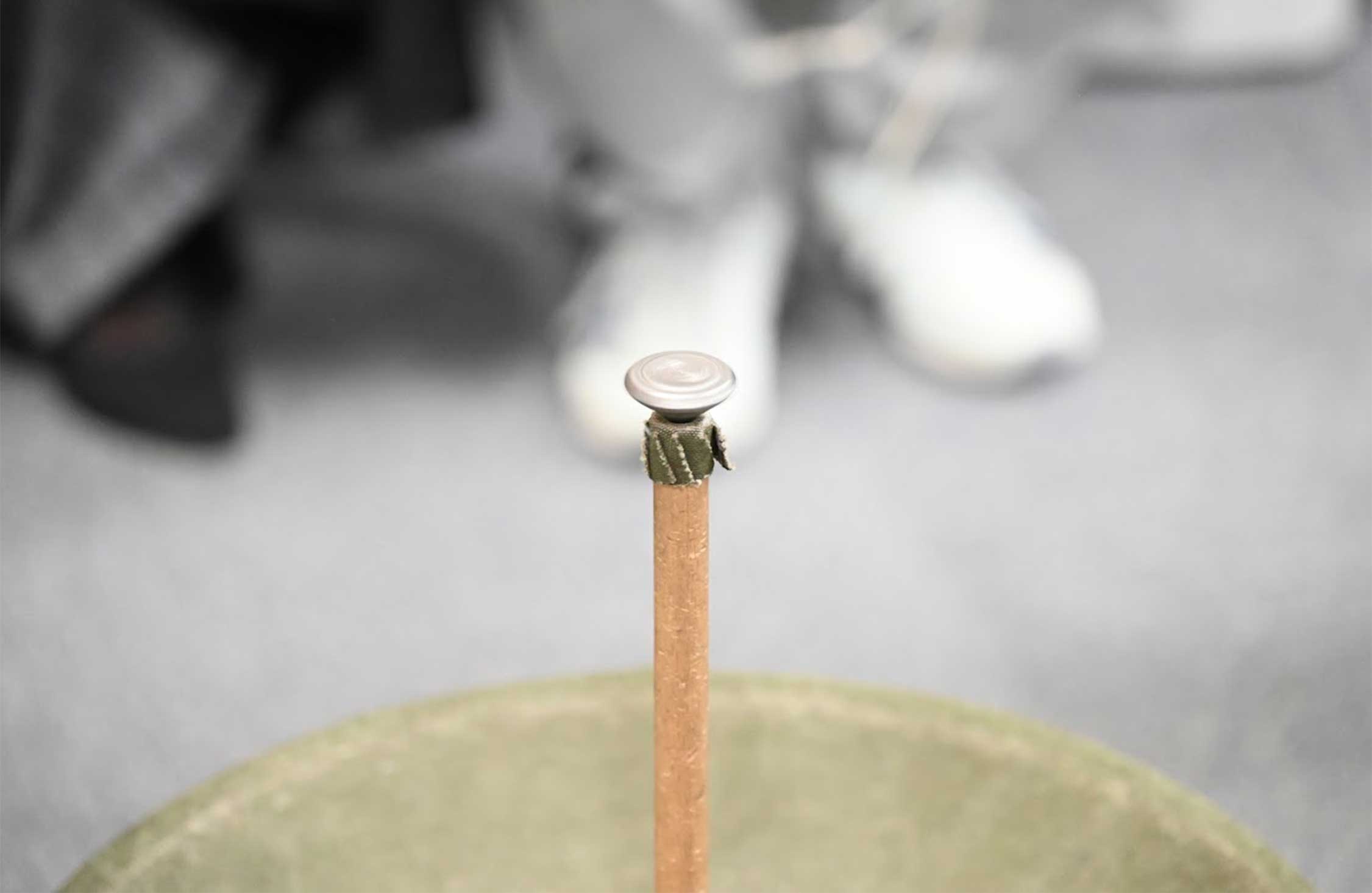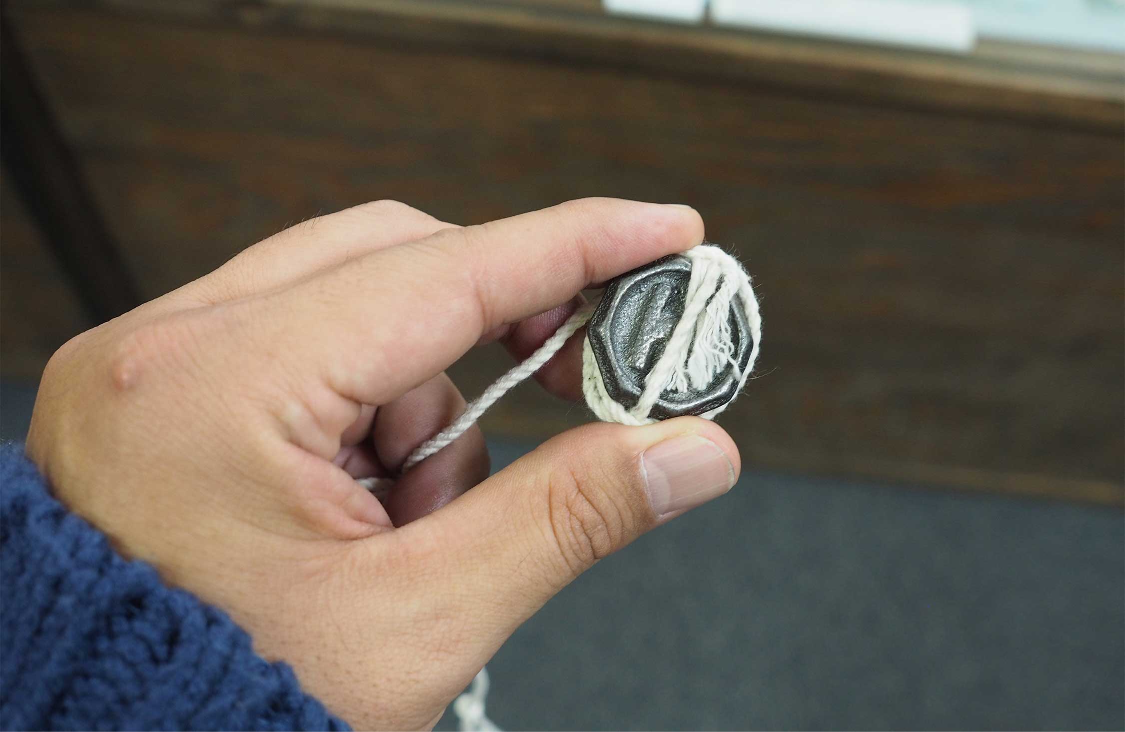 加藤さんと同時期にベーゴマを始めた同じく中学1年生のスタッフ、大竹さんも「2年間、ほぼ毎日」郷土資料館に足を運び、ひたすら腕を磨いた。取材の日には、1円玉より小さい幅1.5センチの「超ミニ床」に3度もベーゴマを乗せ、子どもたちをざわつかせていた。