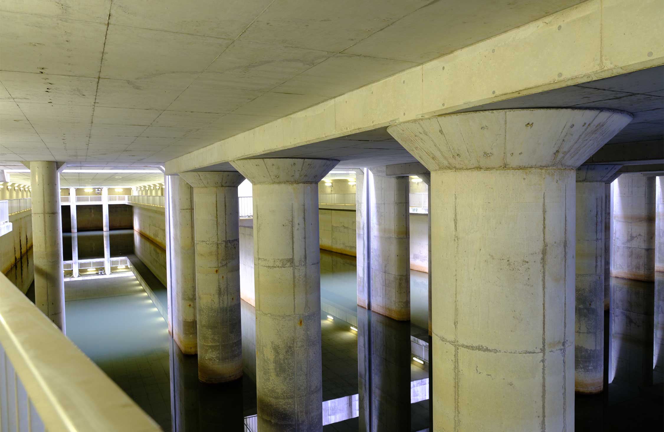 階段を降りていくと、「壮麗」と言いたくなる空間が広がる。薄暗い水の中に光が差し、コンクリートの巨大な円柱が何本も並ぶ。まるで神殿のようだ。かすかな物音も「ワァァァーン……」とよく響き、ここはいったいどこだ? と思うほどの神秘的な空気が漂っている。