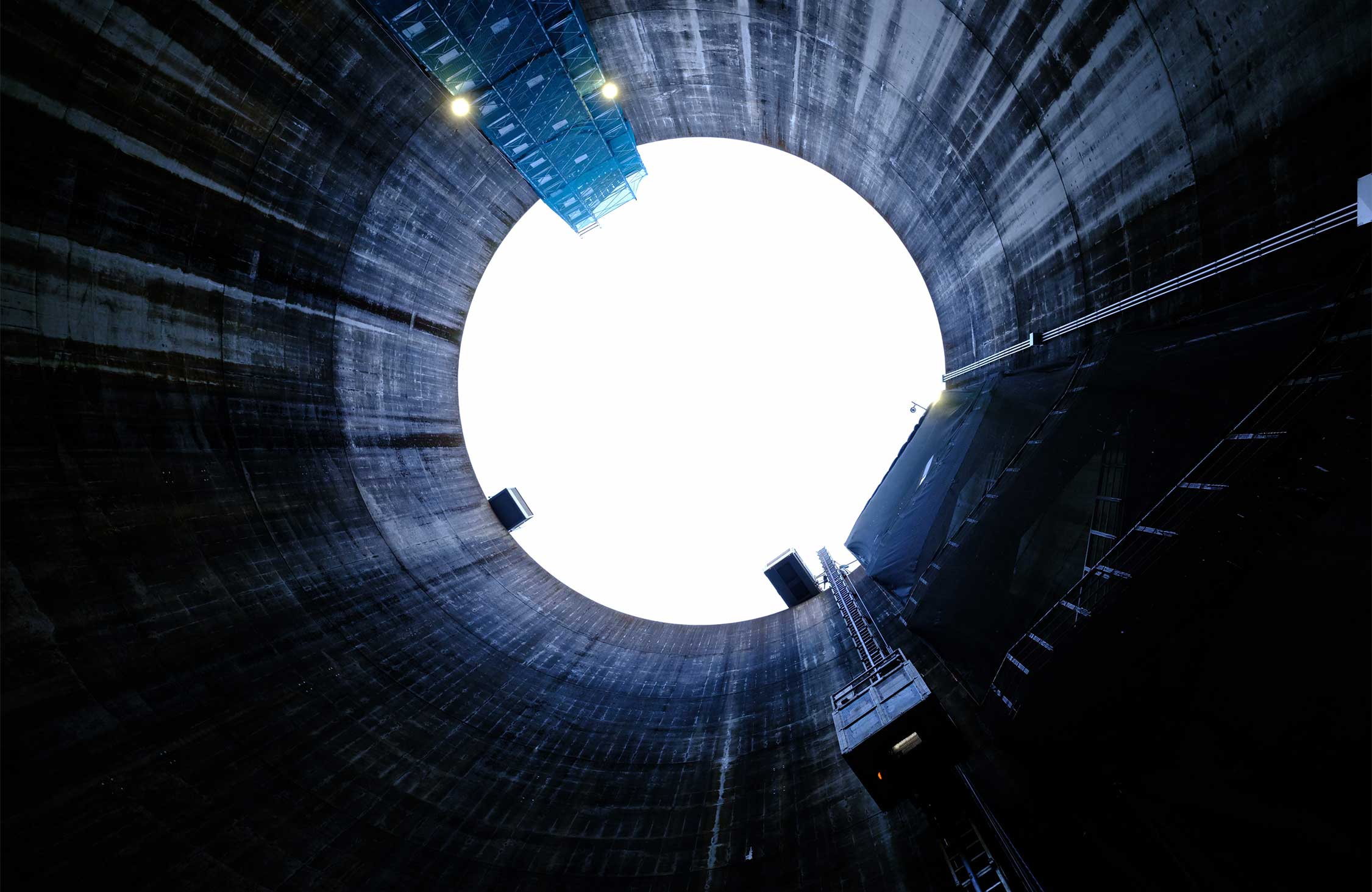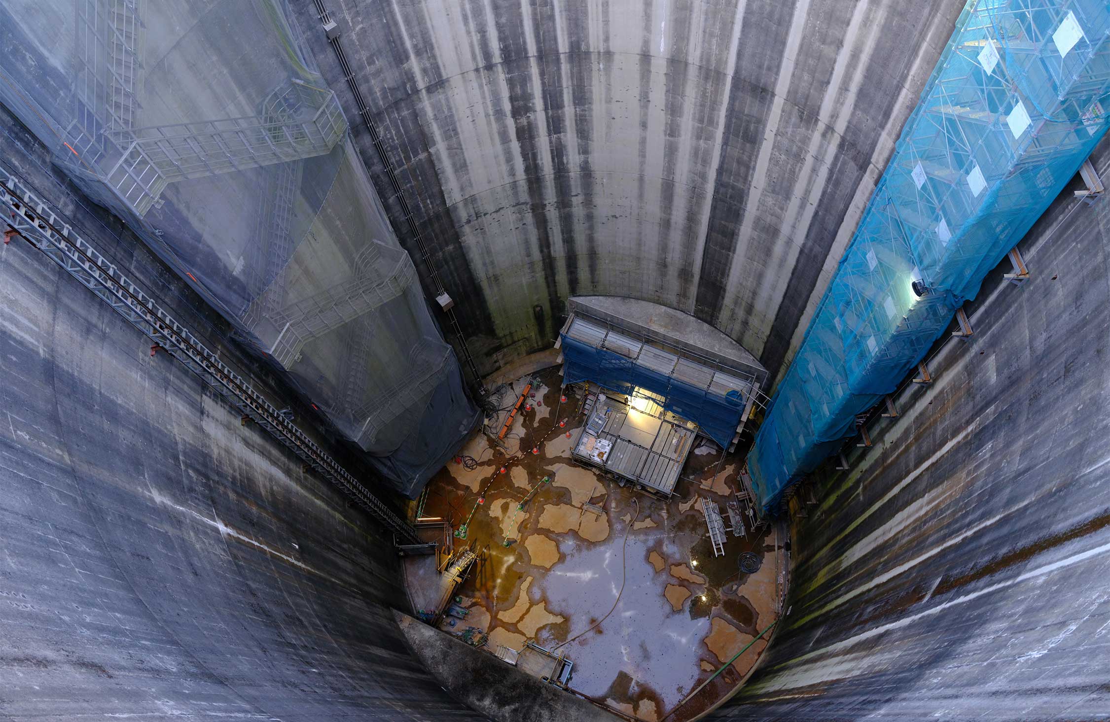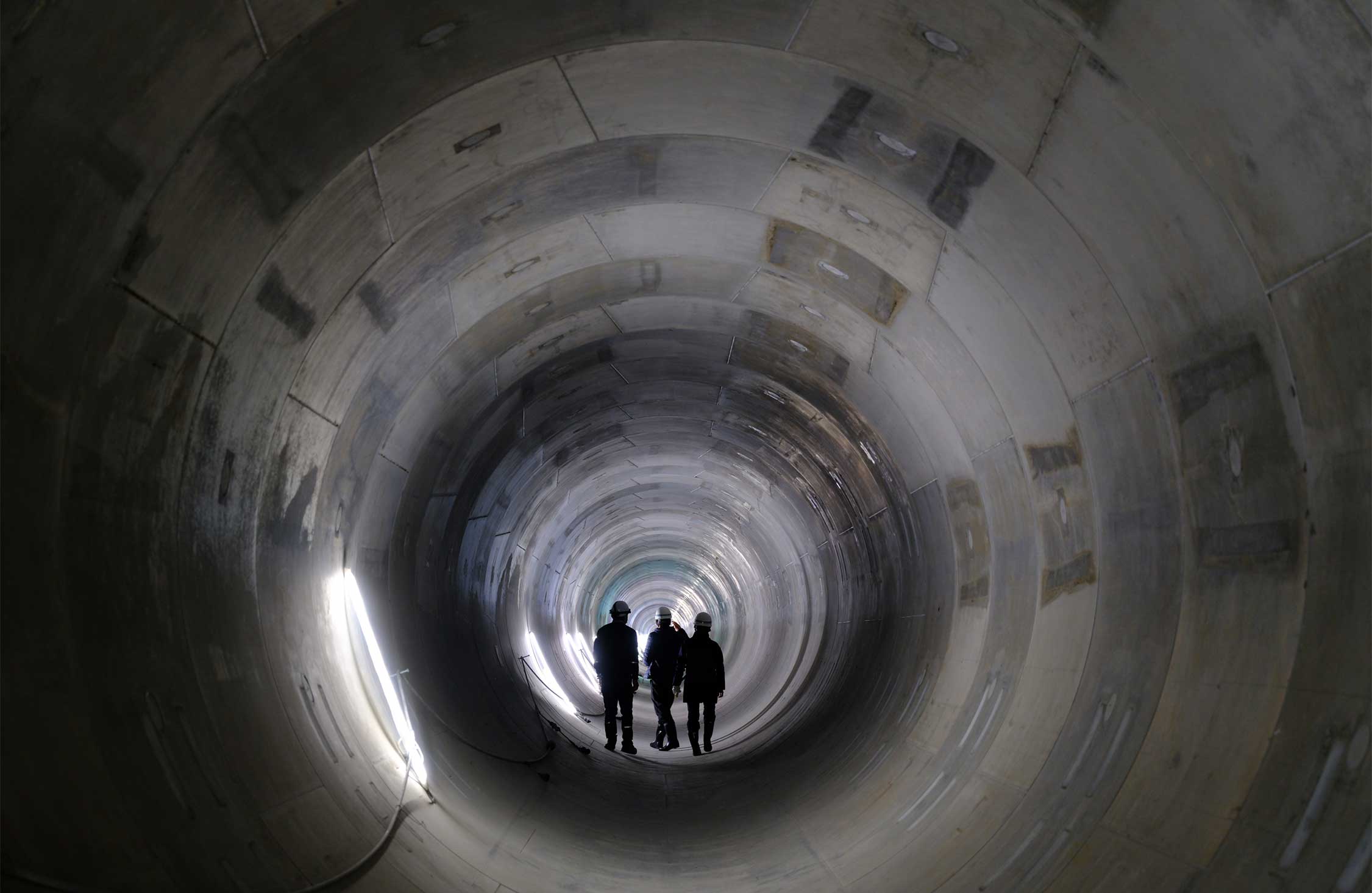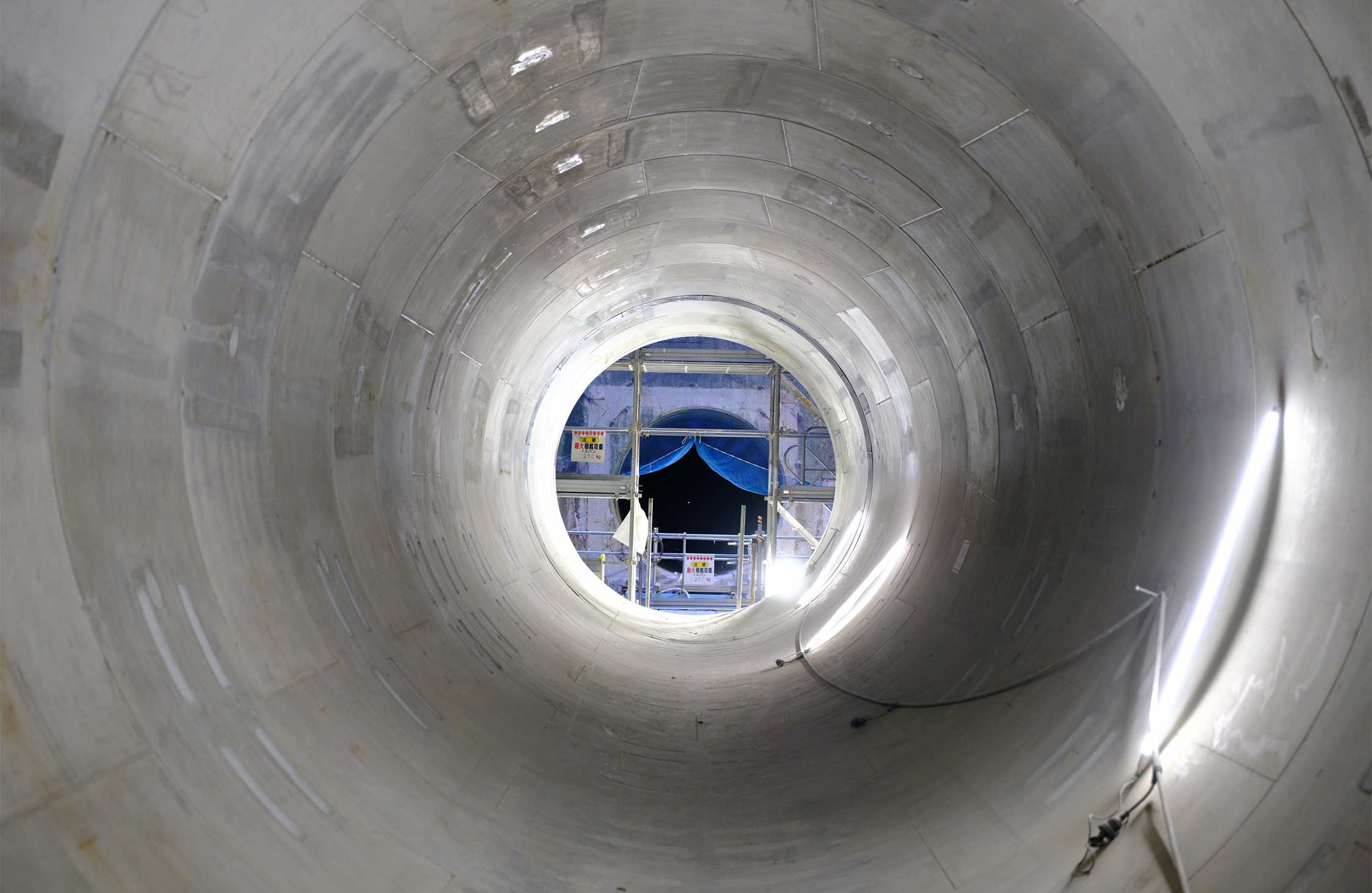 地下40メートルの底へと辿り着くと、そこには驚くべき光景が広がっていた。上を見上げれば空が、そして左右を見れば、完成したばかりの真新しい巨大トンネルが通じていた。40年も続く事業だが、この先いつかはこのトンネルは完成する。そうすればここには水が流れ、二度と来られなくなる。この景色は永遠に見られなくなるのだ。今しか見られない特別な風景なのか……と思うと、不思議な気持ちだった。