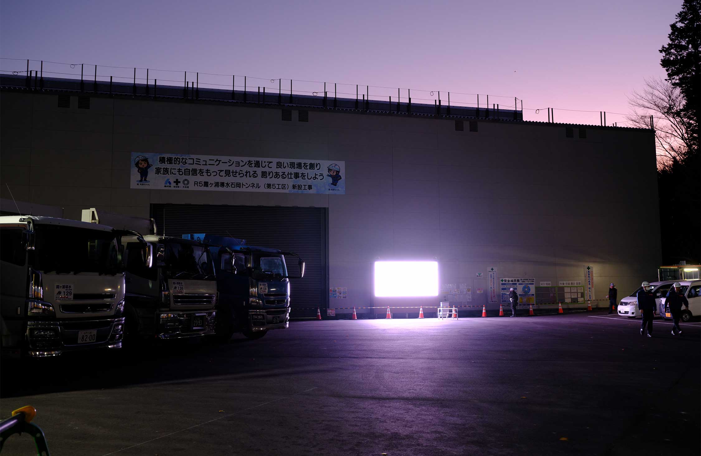 すっかり夕方になった頃、玉里立坑へと到着した。ここはシールドマシンという最新技術を駆使して、地下40メートルの位置で霞ヶ浦から那珂川へと向かって、今まさにトンネルを掘り進めている工事現場だ。この立坑の周辺は工事現場のすぐ近くに工場や住宅などが多い。そこで周囲の環境に配慮して、工事現場全体を途中から巨大な防音ハウスで覆ったそうだ。