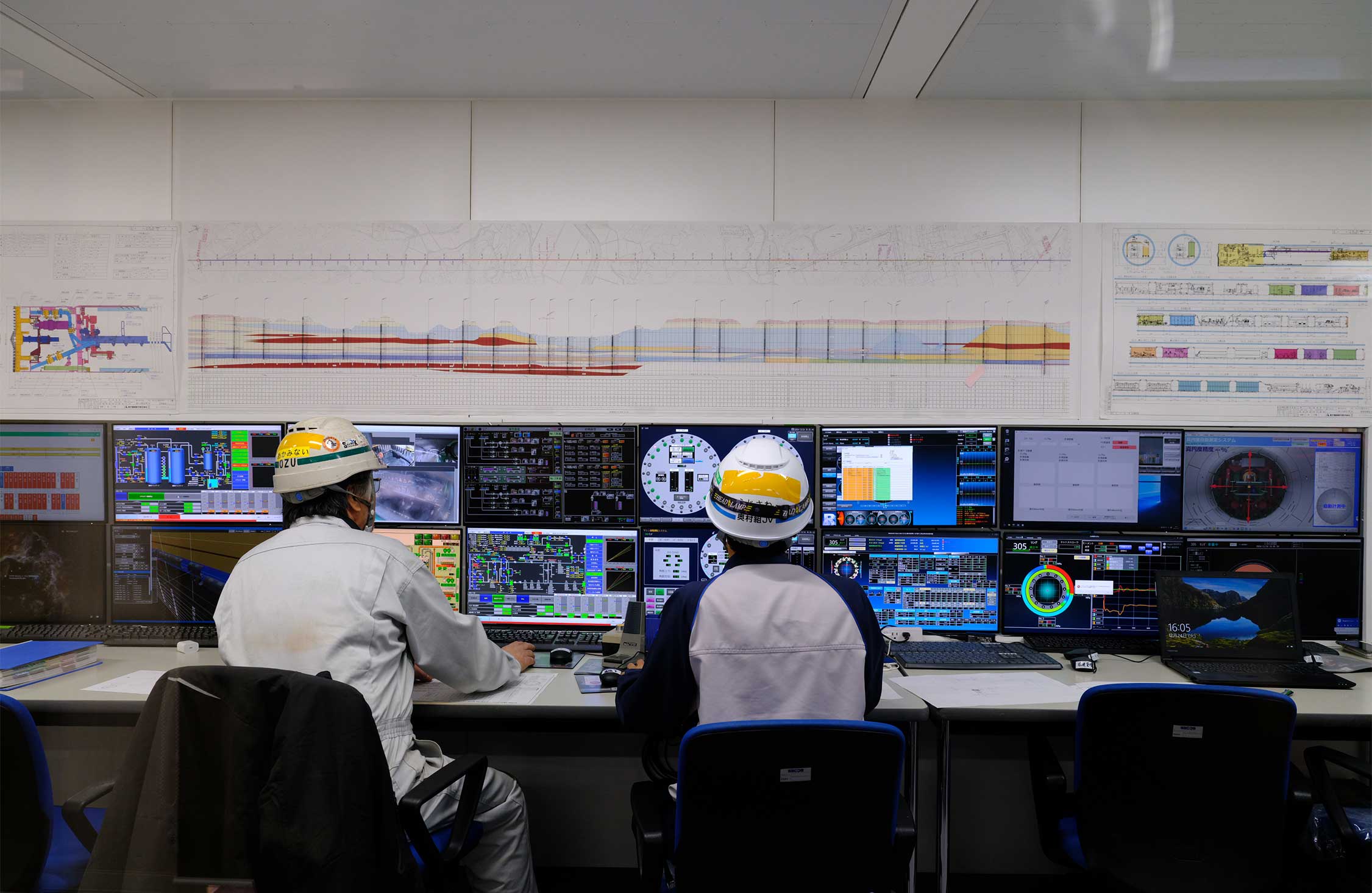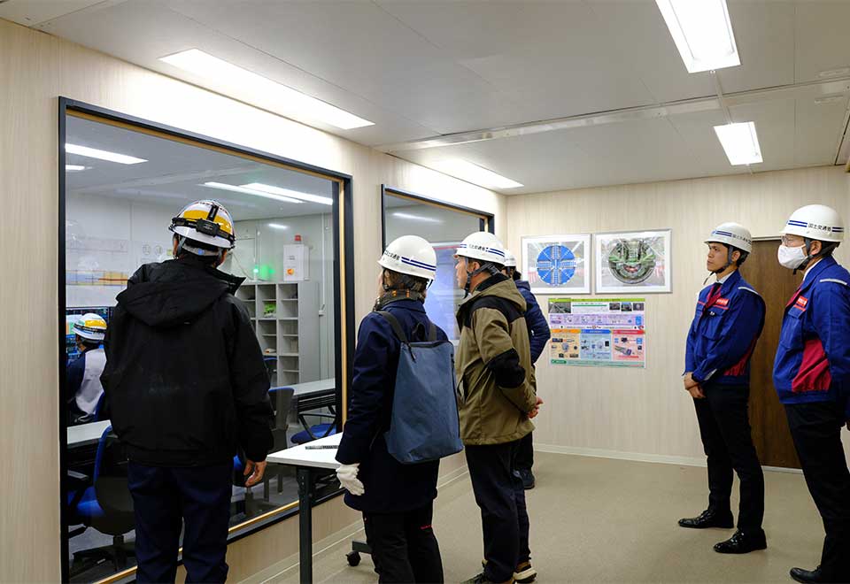 まずは巨大モニターで工事現場のビデオを見て、工事状況の説明を受ける。さらに中央制御室を見学した。トンネルを掘削する円柱型のシールドマシンは、部品を立坑から地下までおろし、それを地下で組み立てて、土砂を掘り進めていく。制御室はこのシールドマシンをコントロールする大事な部屋なのだ。