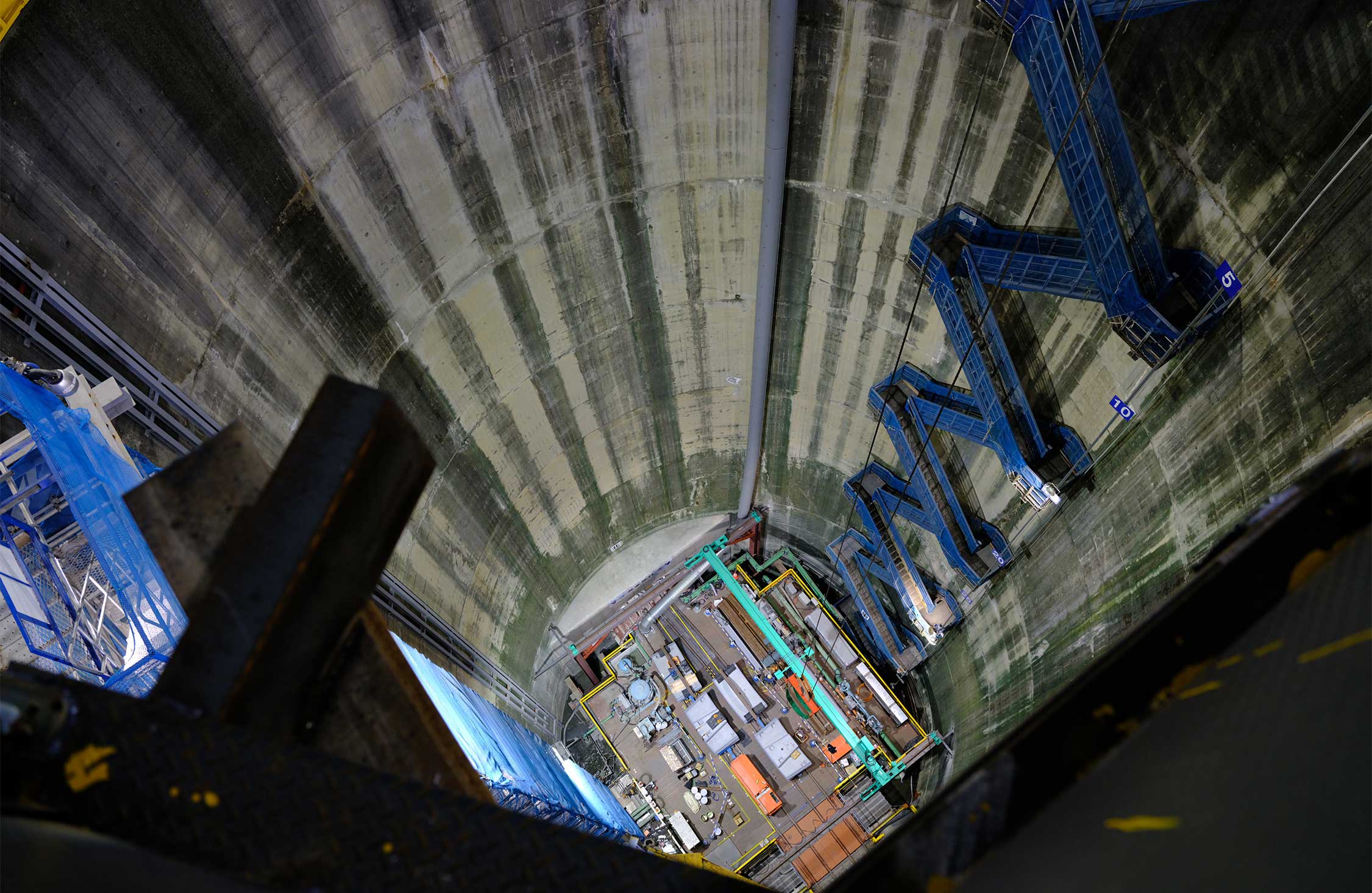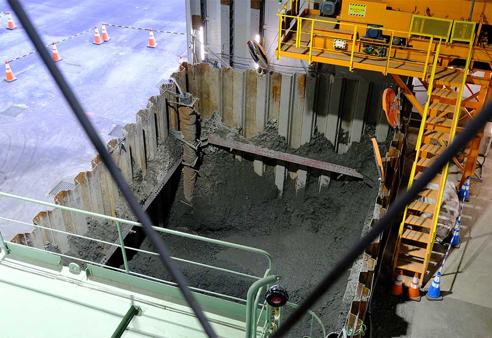 さて中央制御室を出て、ヘルメットを被って、地下の現場へ向かう。立坑の上から地下の景色を覗くと、先ほどの茨城立坑と同じように深い穴が広がっている。立坑の周りにもさまざまな部品の整理や、掘削した土砂などを処理する場所などがあった。