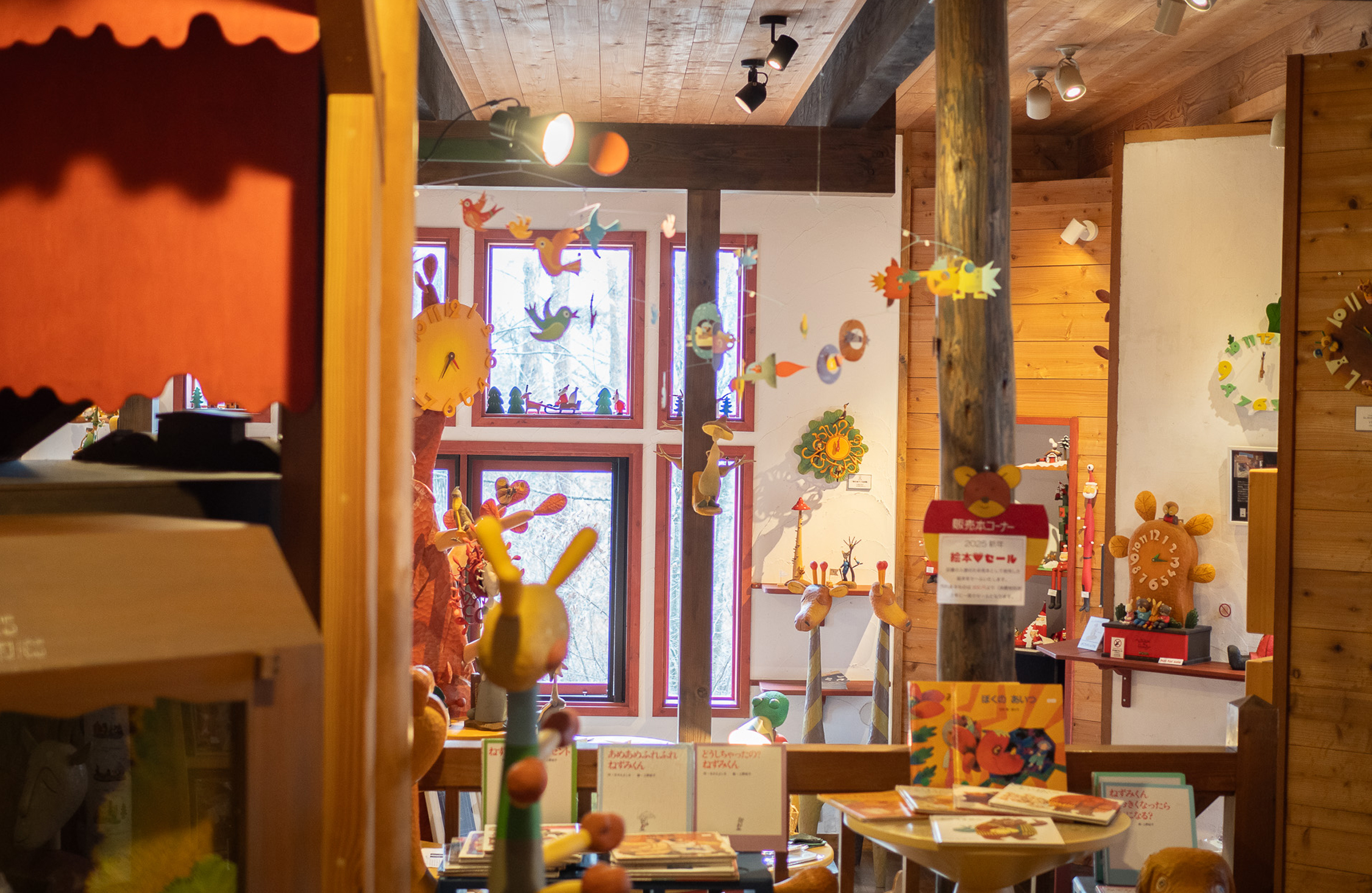 カラフルな文字で「えほん村」と書かれたドアを開けると、そこはまるでおもちゃ箱のようだった。大きな窓から光が差し込む1階にも、螺旋階段を上がった先の2階にも、世界中の絵本がびっしりと並べられている。さらに、今にも動き出しそうな木製の動物や妖精、魔女たちが顔を出す。いろいろなものが詰め込まれているのに、心が落ち着く不思議な空間だ。